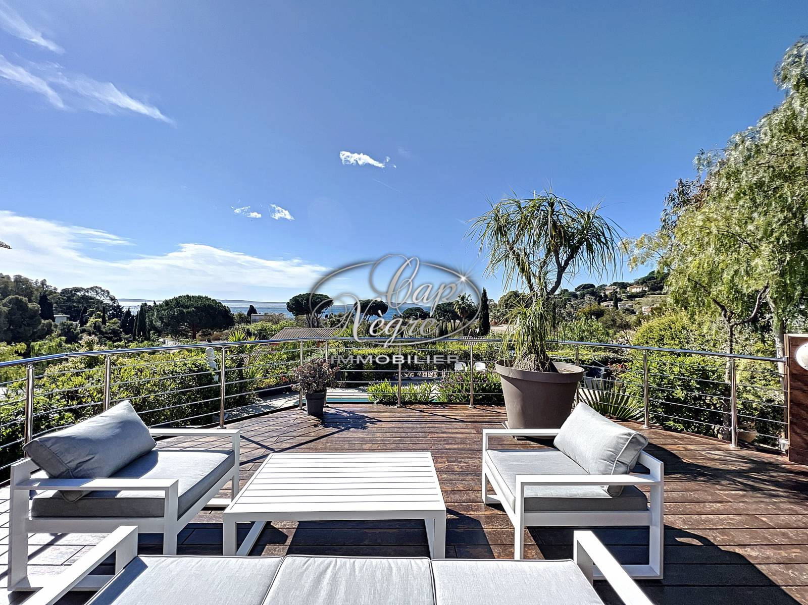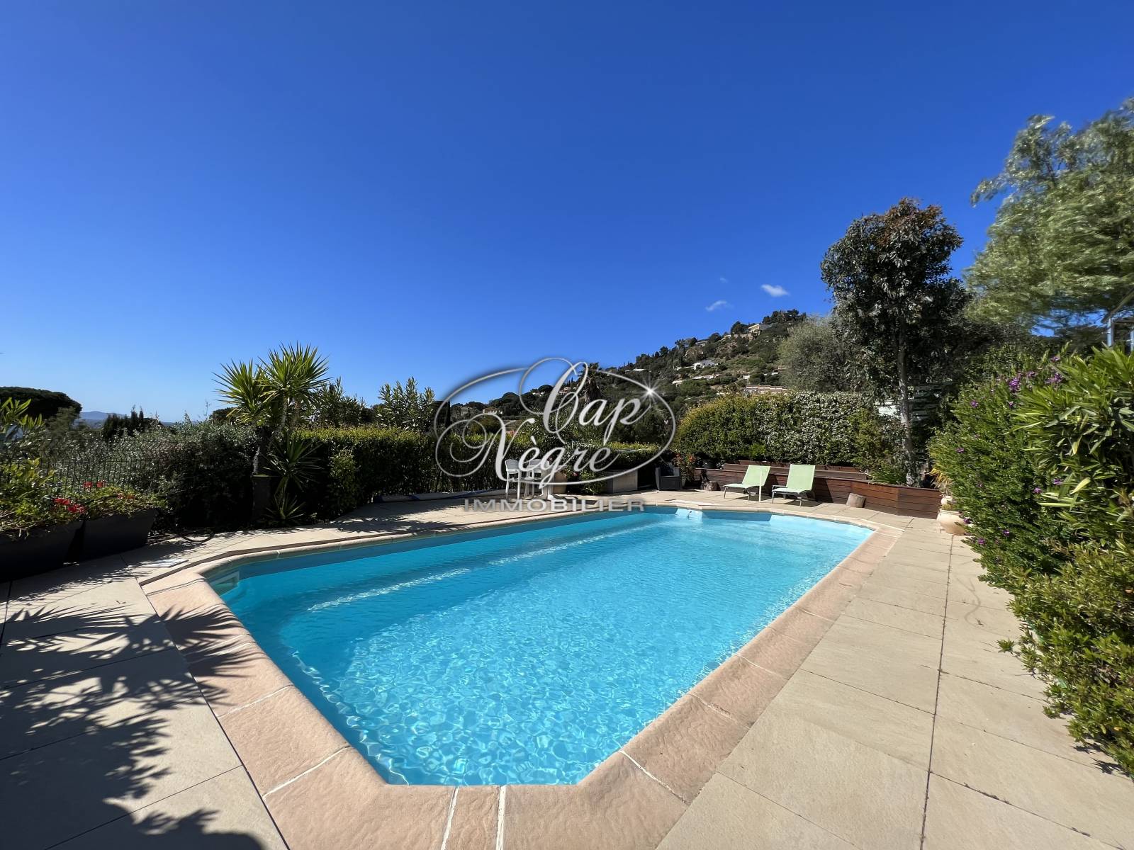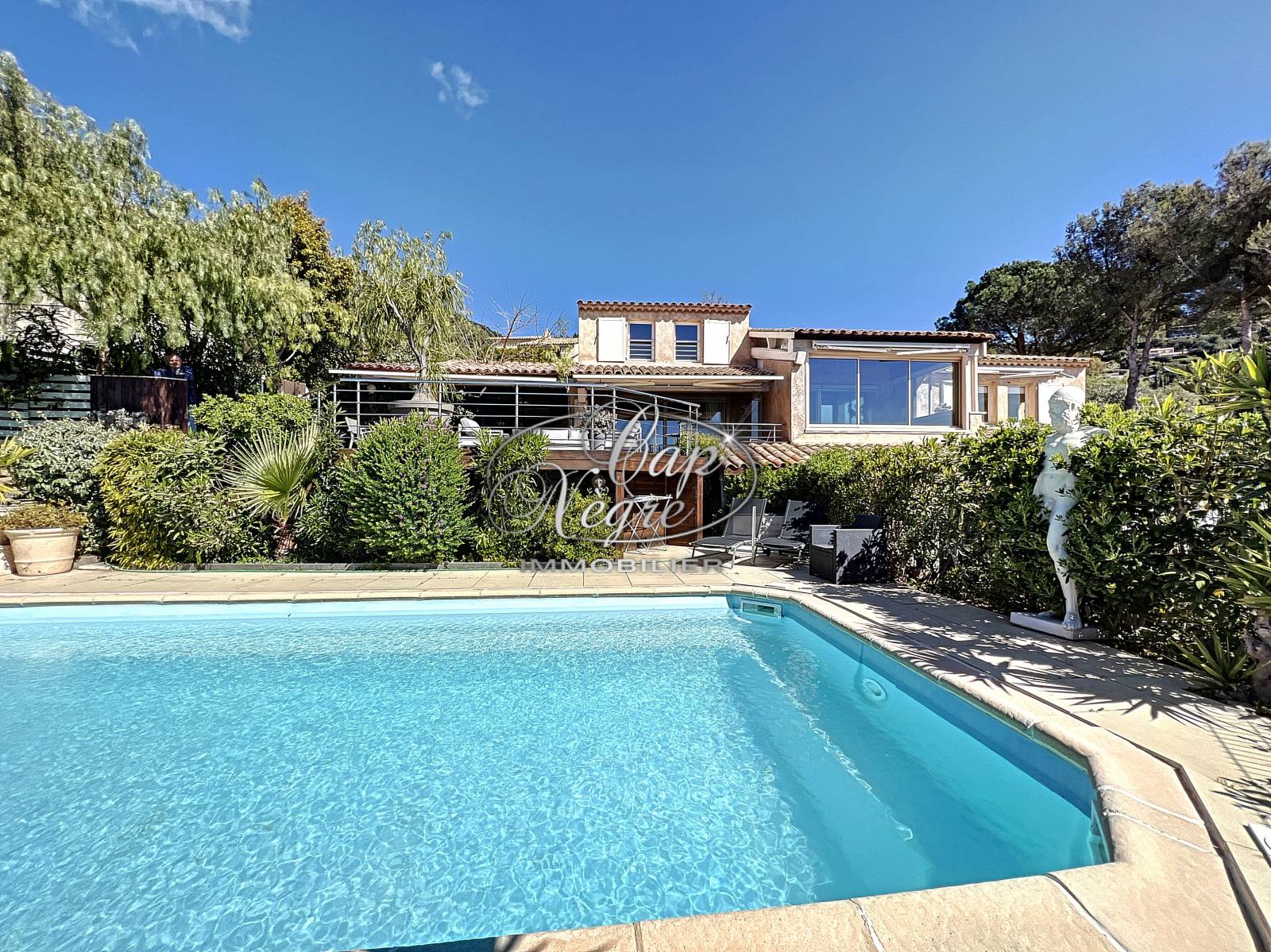 Construite sur un terrain arboré de 1160 m² avec un accès à pied à la plage, cette sublime propriété de 255 m² orientée plein Sud avec vue sur la mer et les îles d'or, se compose: