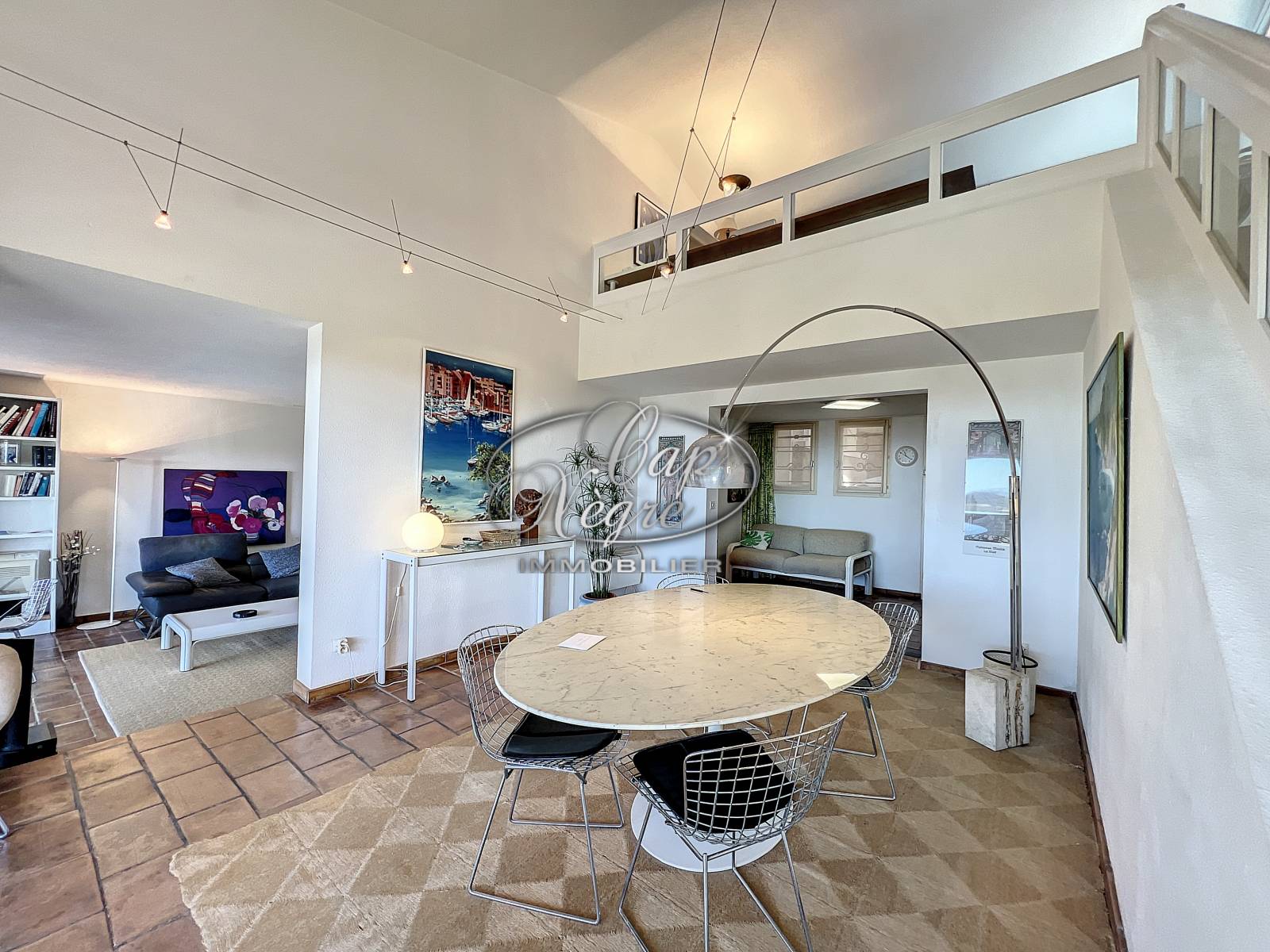 - un spacieux séjour avec mezzanine de 80 m² et baies vitrées coulissantes, cuisine séparée entièrement équipée vue mer, 2 chambres et 2 salles de bains, un bureau, un atelier et WC séparés.