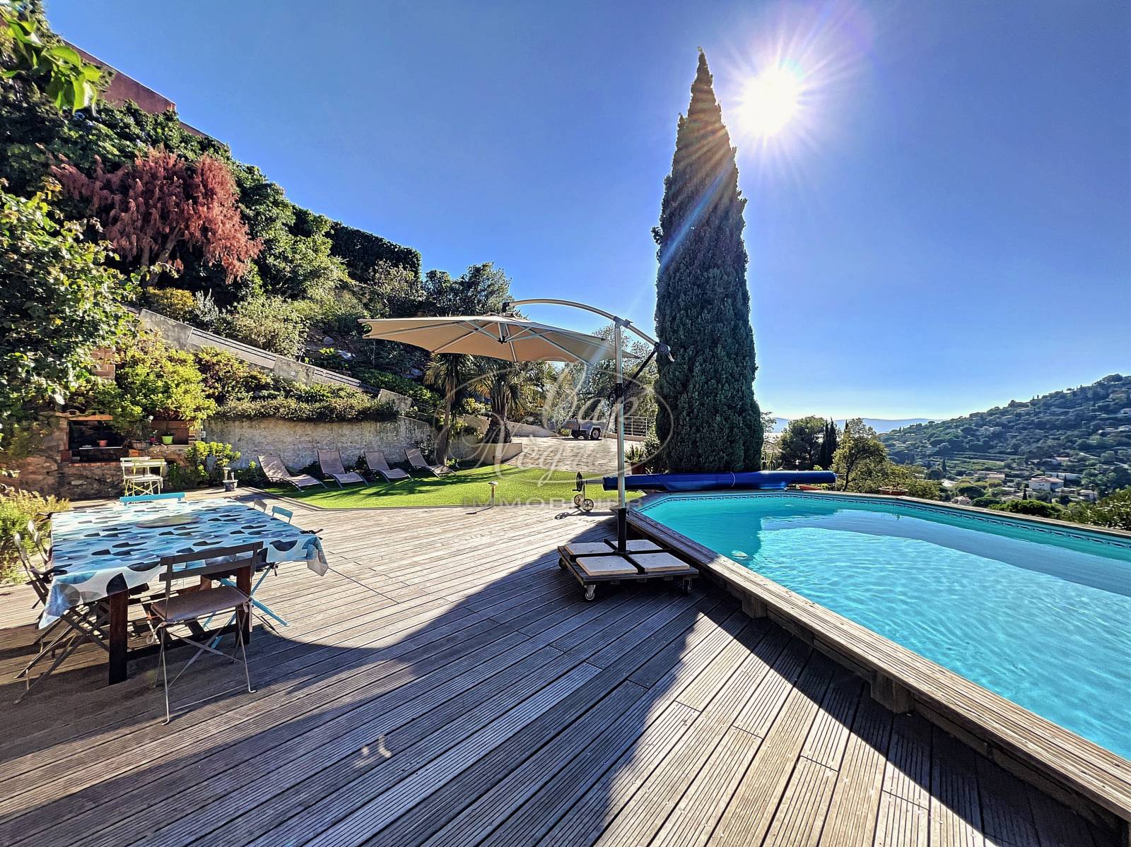 Située dans un environnement verdoyant et préservé, cette maison édifiée sur un terrain de plus de 1500 m² se compose au rez-de-jardin d'un bel espace de vie avec double exposition Sud/Ouest et s'ouvre sur la terrasse, la piscine puis le jardin avec vue sur les collines et la mer ; une cuisine séparée et équipée, une buanderie et des wc.