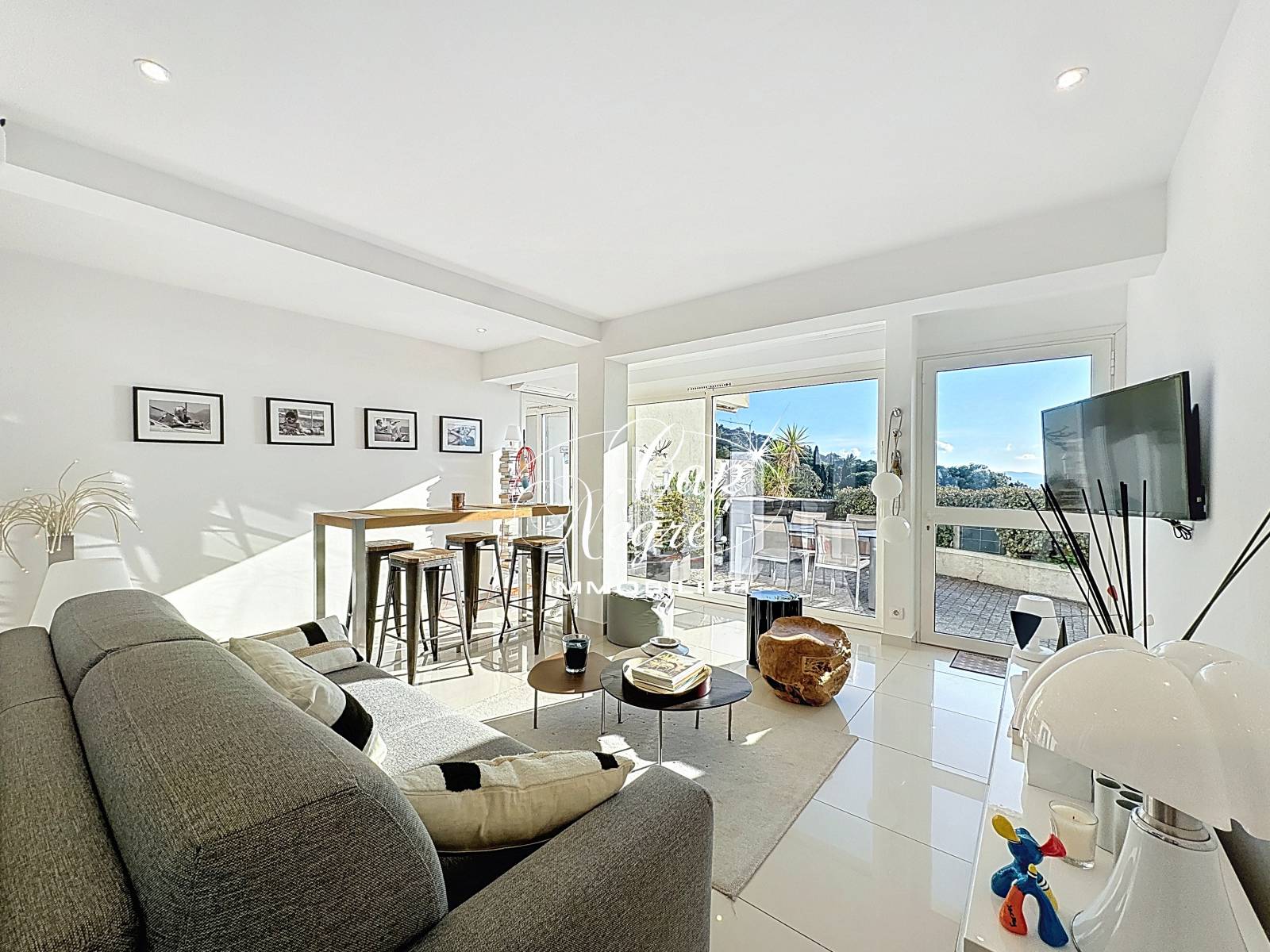 L'extérieur s'ouvre sur un bel espace jardin-terrasse d'environ 10 m², idéal pour profiter des beaux jours, avec une superbe vue dégagée sur la mer.