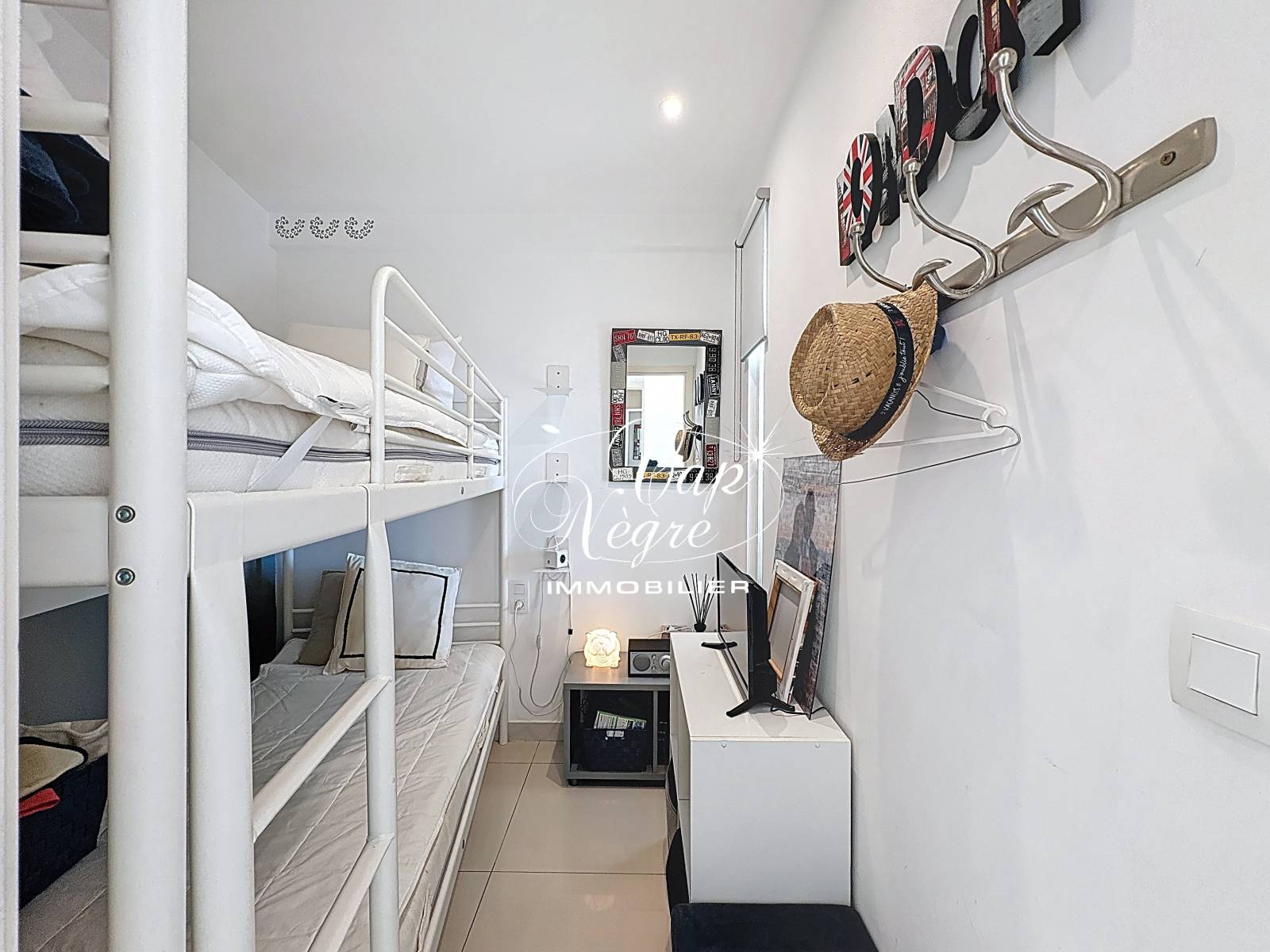 De l'autre côté de l'appartement, un coin nuit indépendant avec lits superposés bénéficie de sa propre salle d'eau avec WC, offrant une configuration idéale pour recevoir famille et invités.