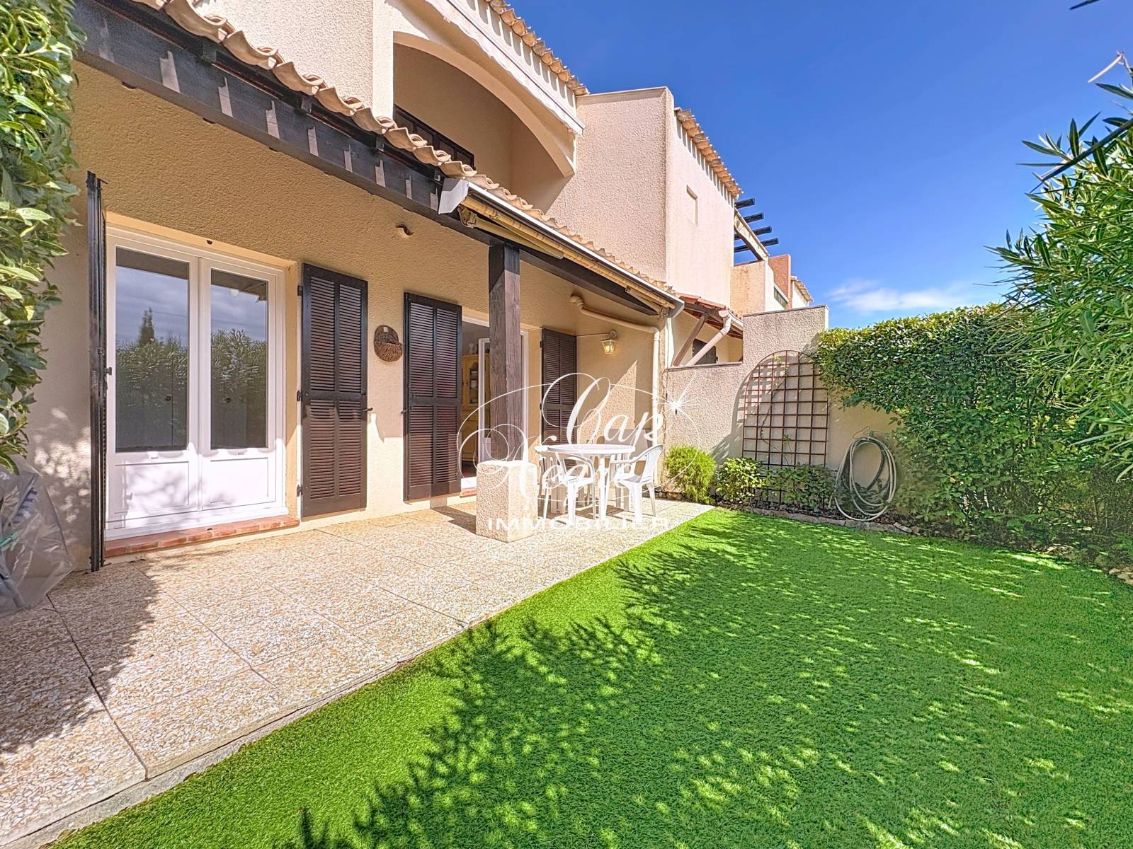 L’extérieur, orienté plein sud, permet de profiter pleinement du climat méditerranéen dans un environnement calme et arboré.