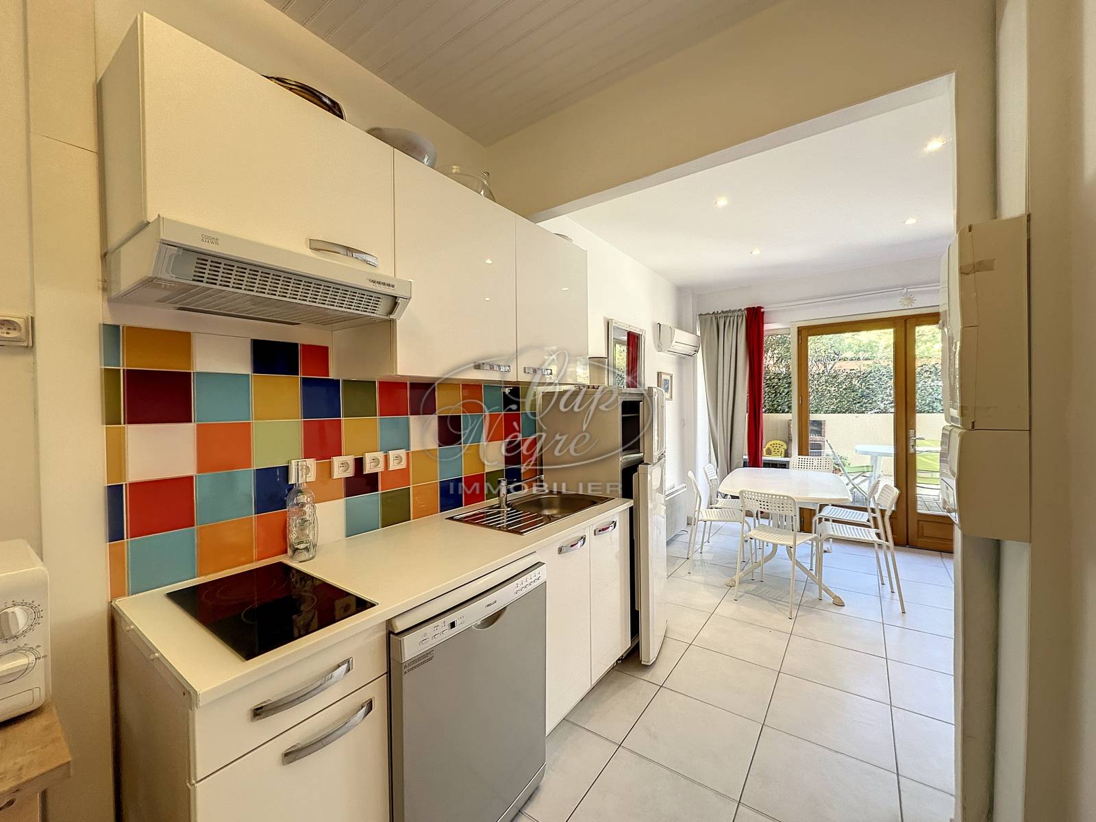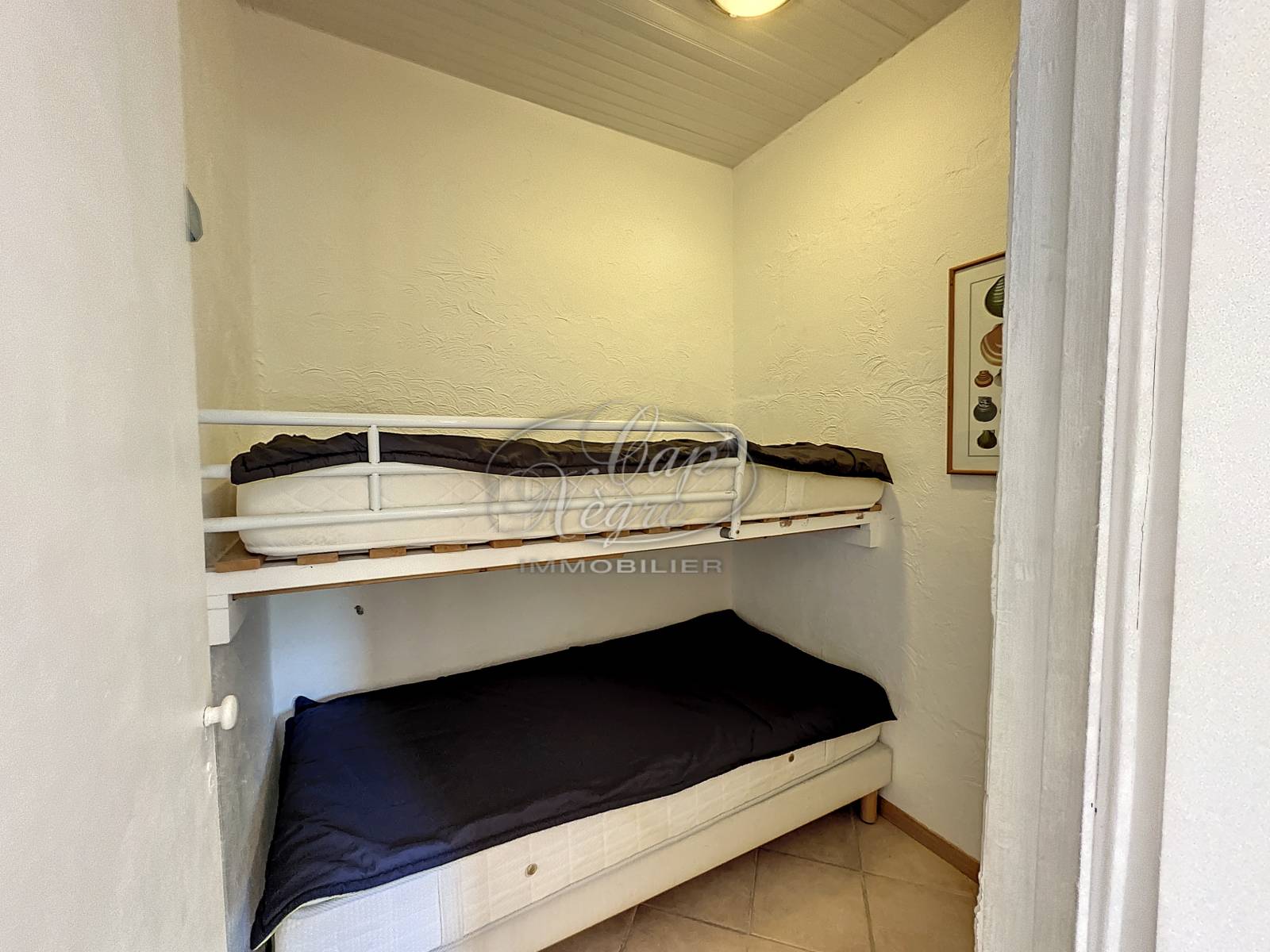 Il comprend: un séjour donnant sur la 1ère terrasse avec cuisine ouverte entièrement équipée menant à la chambre double avec rangements et ouvrant sur la seconde terrasse, une salle d'eau avec WC, coin nuit avec lits superposés.