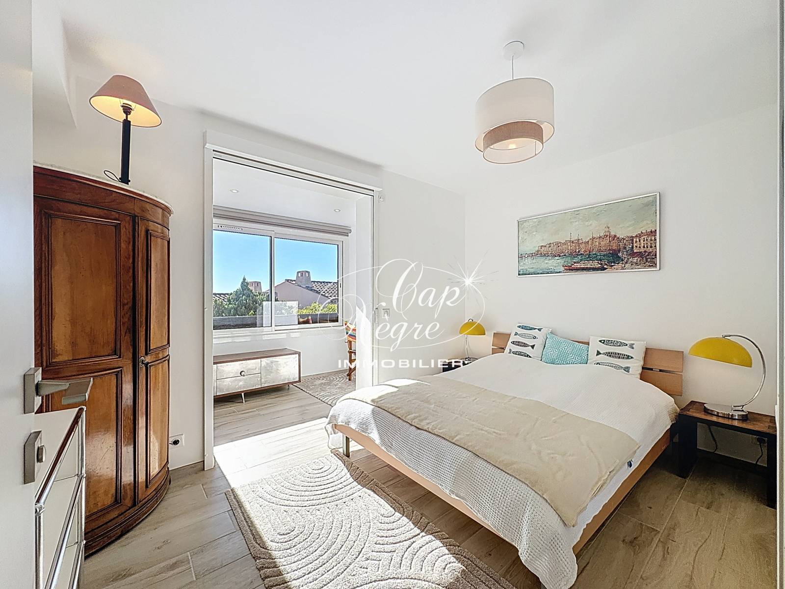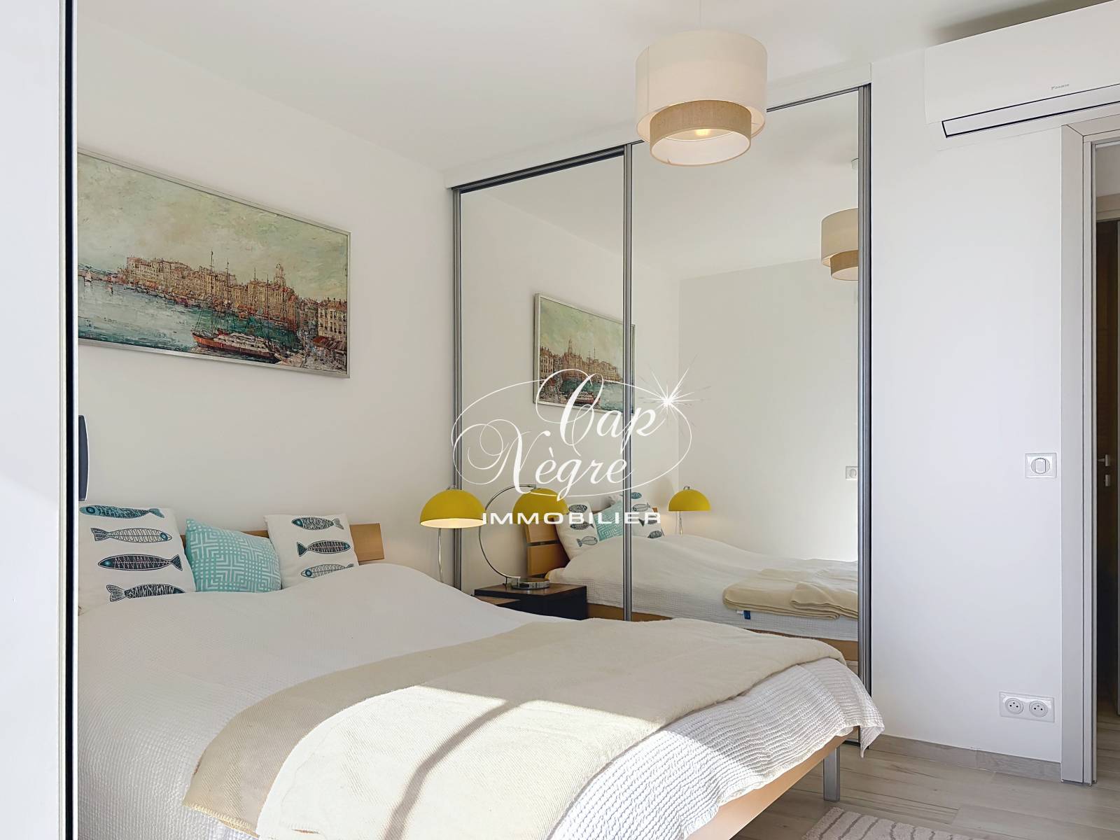 La loggia fermée de 11,5 m², intégrée au logement, accueille une salle à manger et un coin bureau baignés de lumière. Cette pièce dessert la chambre de 11,25 m² dotée d'un placard et d’une toile électrique permettant de séparer la chambre du bureau tout en préservant la vue mer et l’intimité.