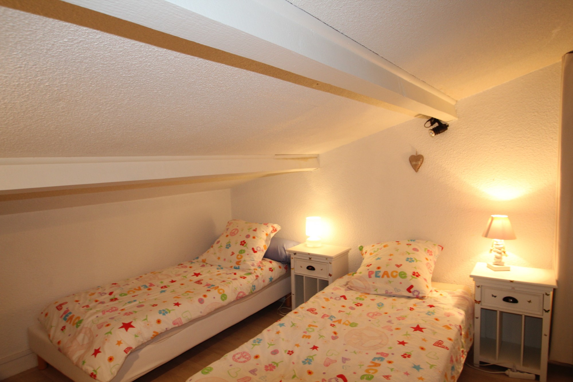 - à l'étage: une chambre avec lit double et vue sur la colline ainsi qu'une mezzanine d'une surface de 9.25 m² hors loi Carrez transformée en chambre avec lits jumeaux.