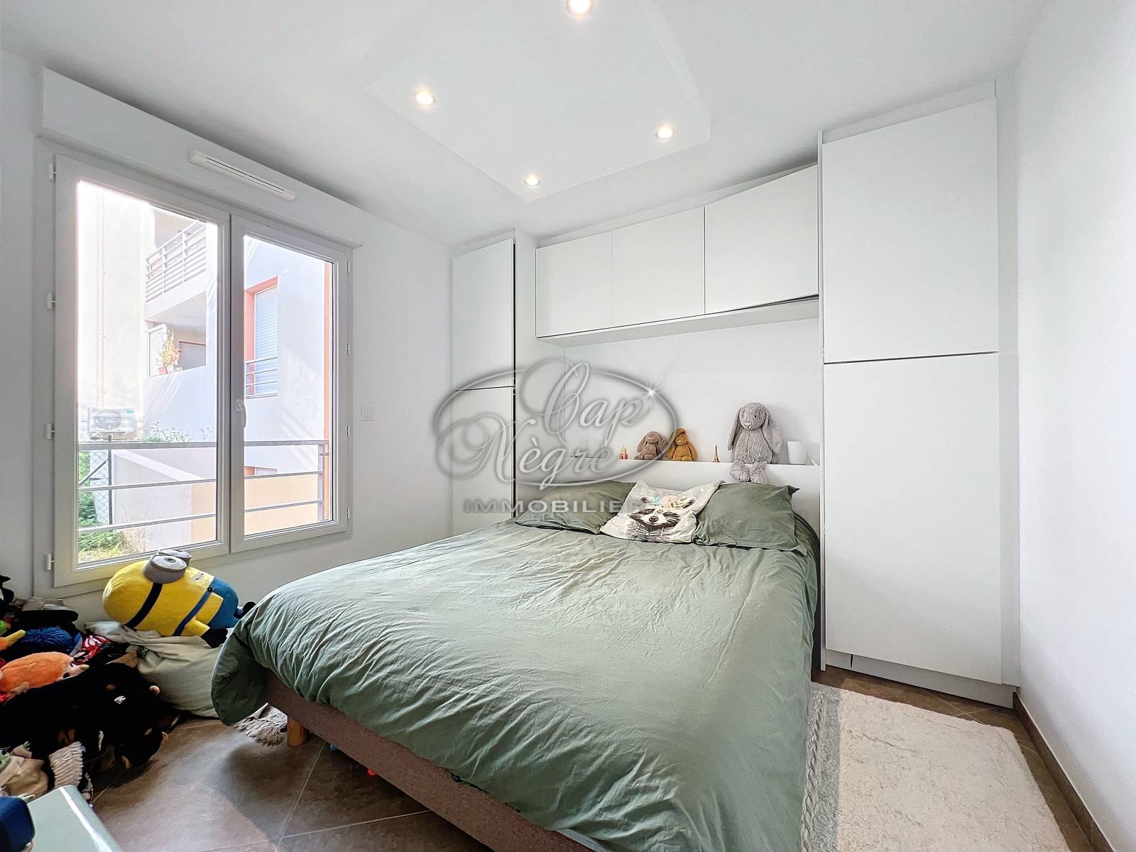 L'entrée avec placard mène au séjour avec sa cuisine ouverte, équipée d'un îlot central. Le séjour lumineux à double exposition offre un espace agréable. Deux chambres avec rangements et une salle d'eau avec w.c. ainsi que des w.c. invités complètent l'intérieur, entièrement meublé et équipé.