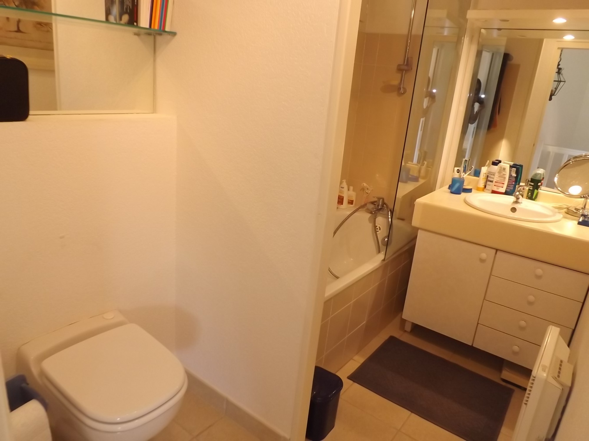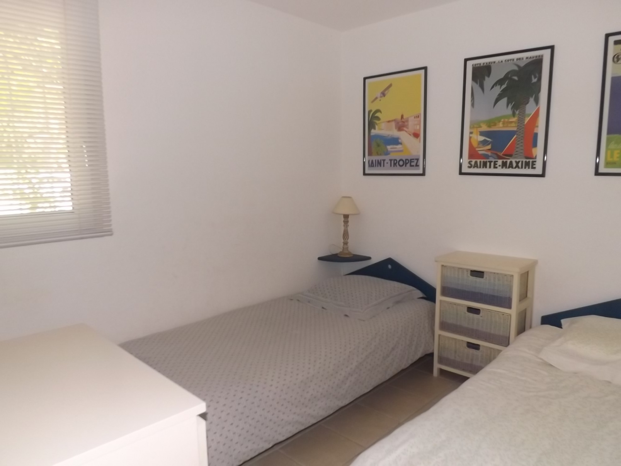 A l'étage: une grande chambre avec solarium, salle de bains, wc. Clim. Volets électriques. Vendu avec CAVE/GARAGE/PARKING. Dpe: en cours.