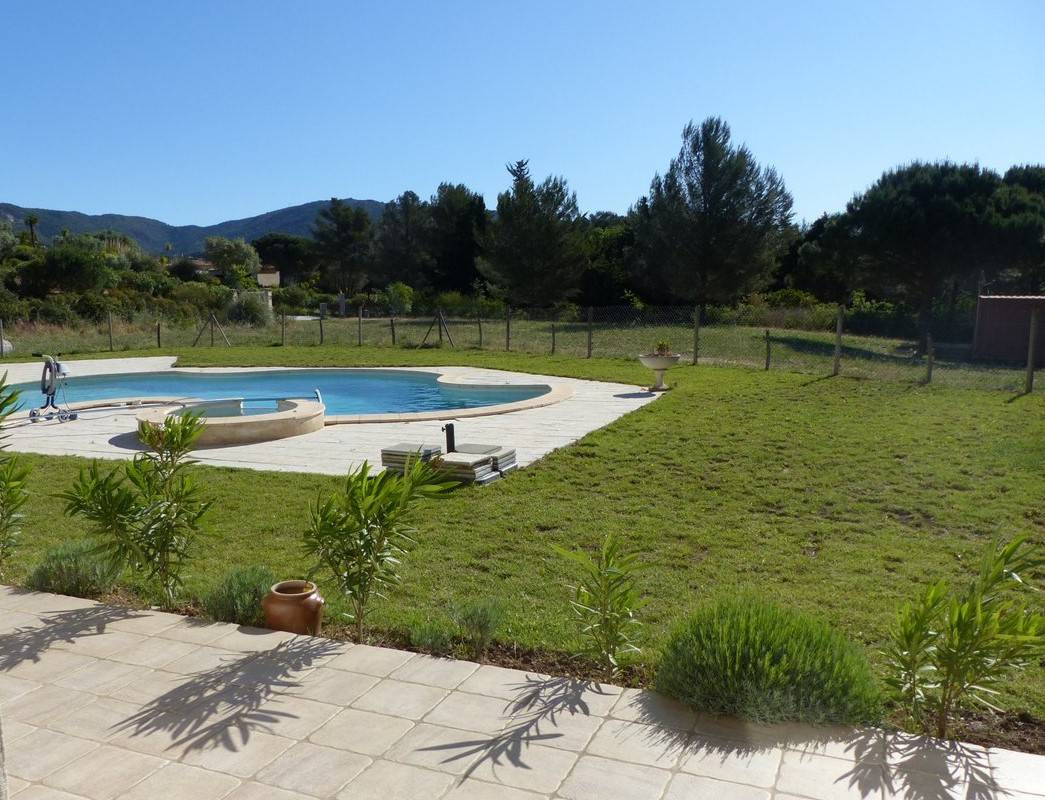 La partie principale composée d'un espace de vie d'environ 70 m² comprenant salon, salle à manger et cuisine équipée, ouvrant sur terrasse et jardin ainsi que la piscine en forme.