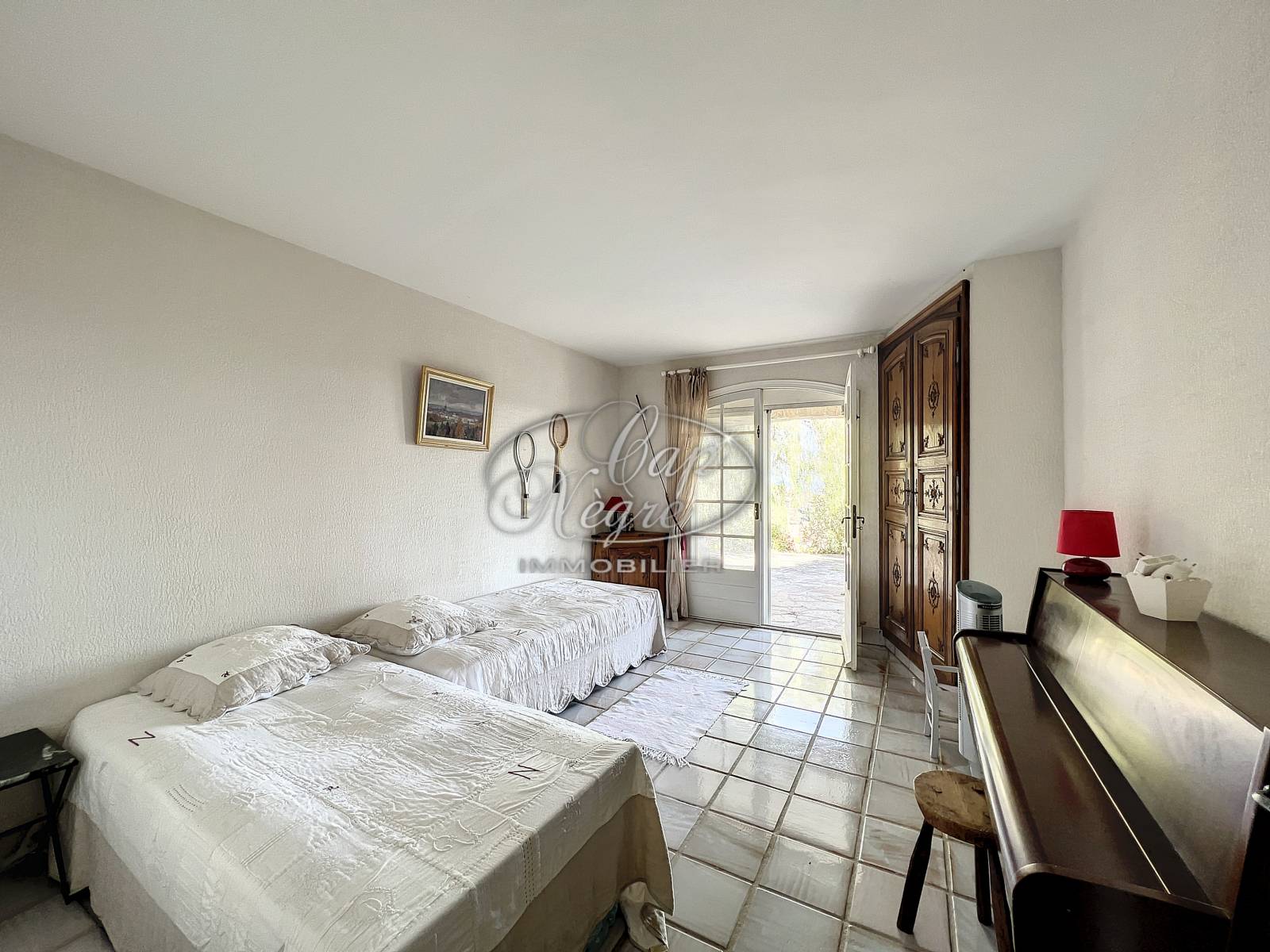 La partie nuit se compose de 5 chambres dont 3 avec vue mer et accès sur l'extérieur; un bureau, une pièce aménagée en cuisine d'été ouvrant sur la terrasse de la piscine peut être transformée en chambre supplémentaire vue mer.