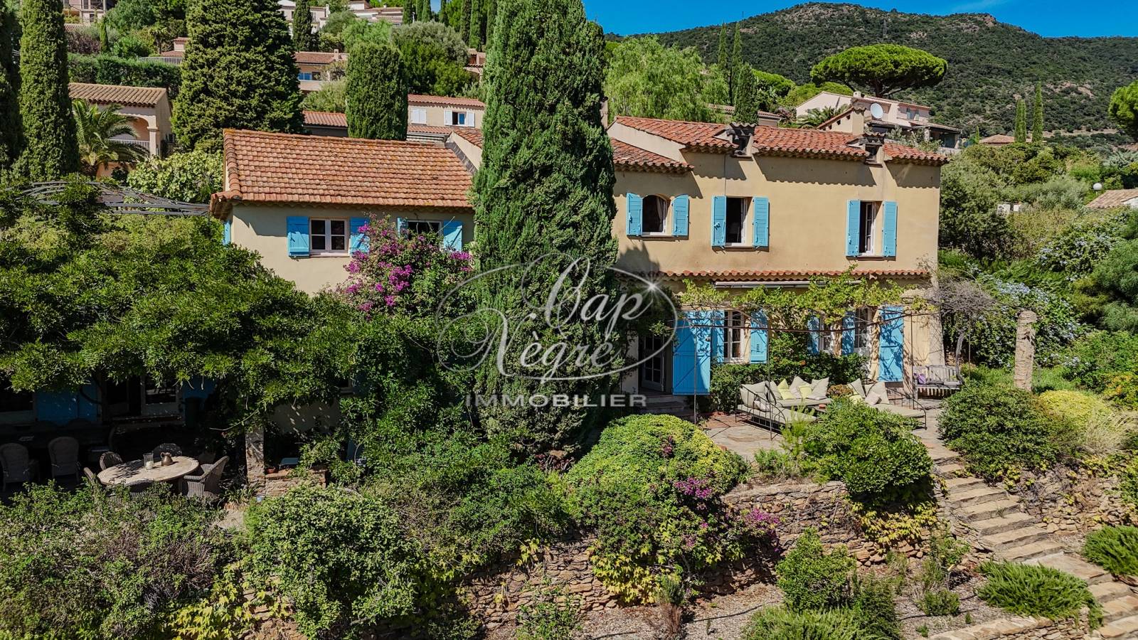 Le terrain d'environ 12 000 m², soigneusement paysagé et arboré, inclut un verger, des restanques en pierre de Bormes, une piscine de 12 mètres par 6 mètres avec son pool house, ainsi qu'un atelier.