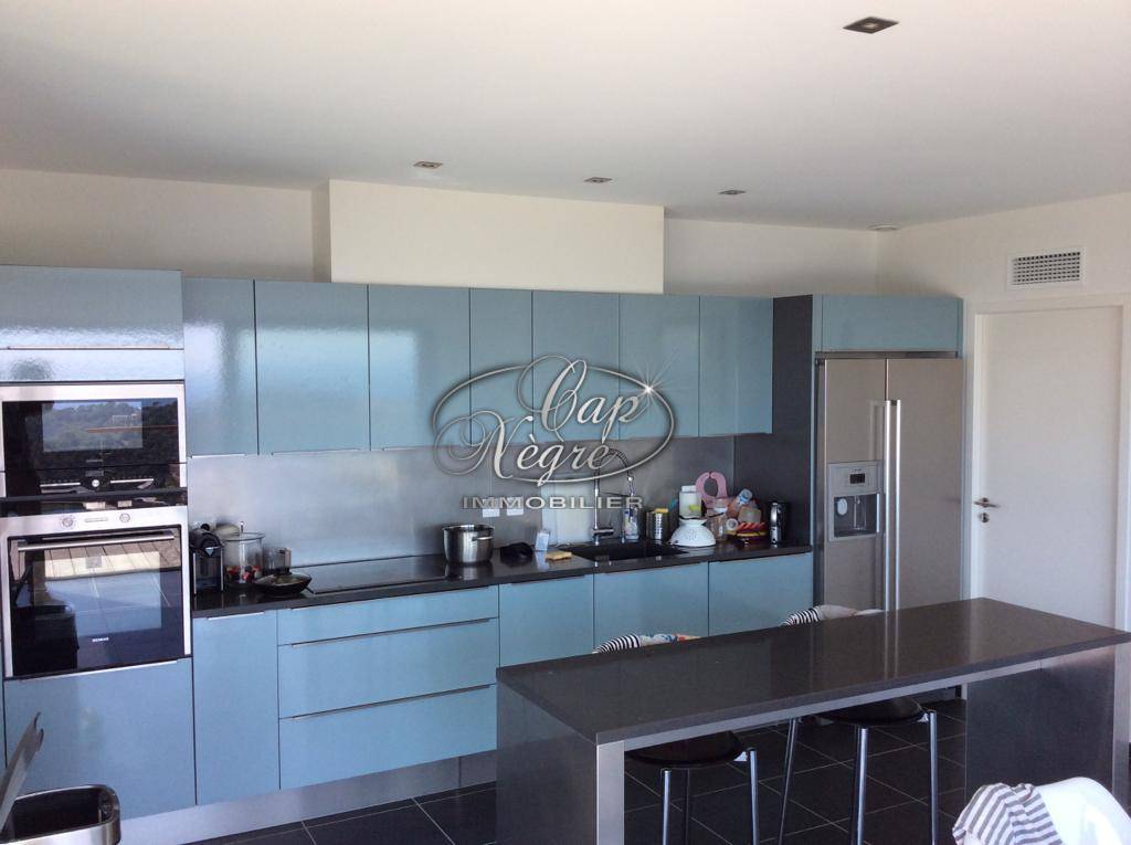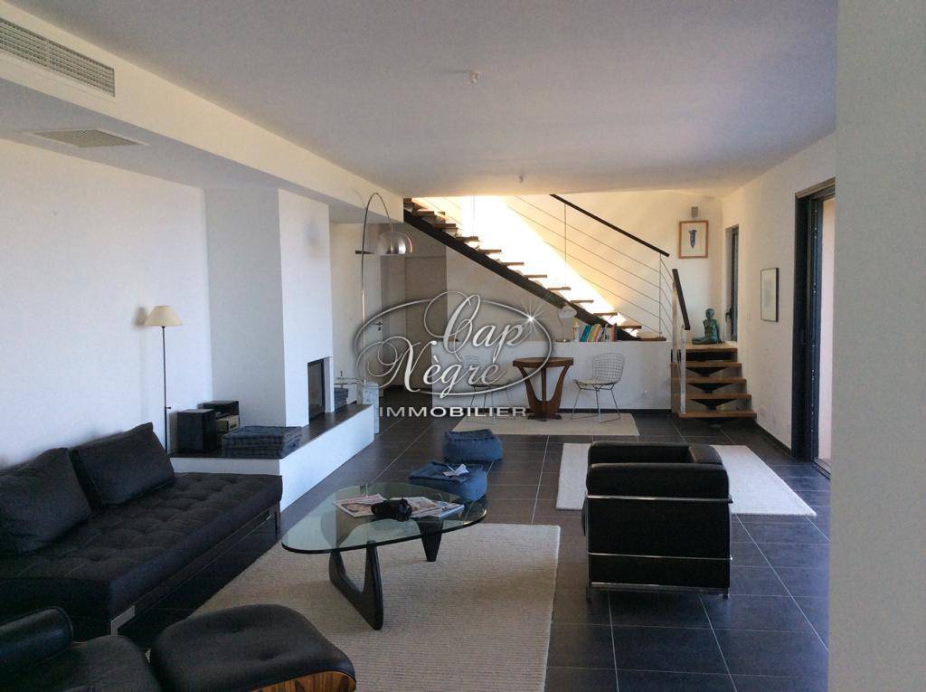 Un bureau surplombe l’ensemble. De nombreuses terrasses (240 m²) prolongent les pièces qui ont toutes une vue mer.