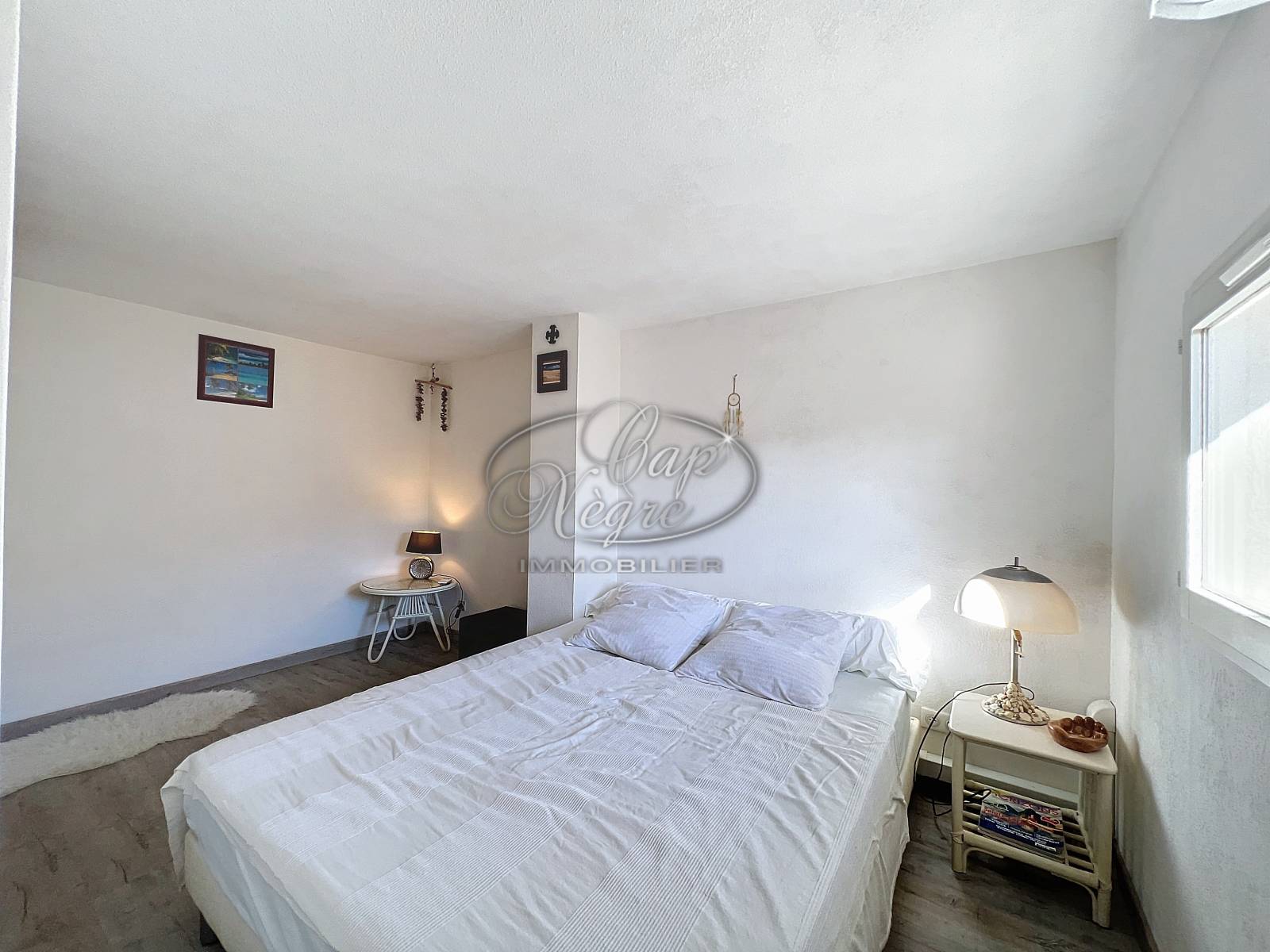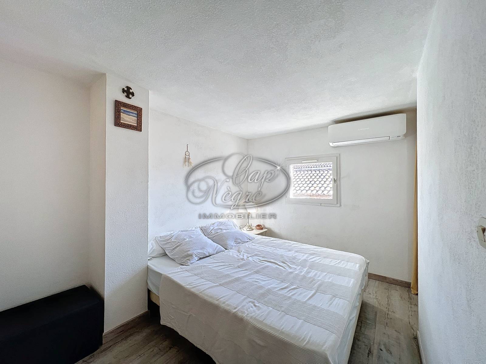 À l'étage, un escalier mène à une chambre orientée au Sud, bénéficiant d'une belle luminosité dès les premières lueurs du jour propose un espace de vie chaleureux. La chambre est également climatisée, vous assurant une température idéale tout au long de l'année.