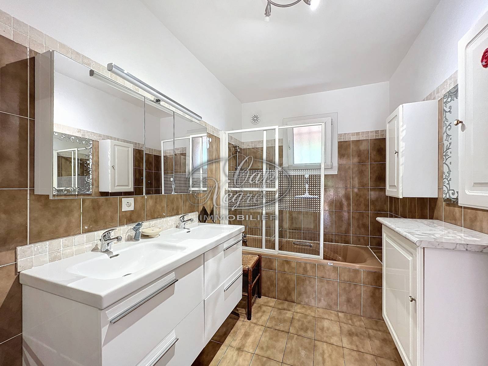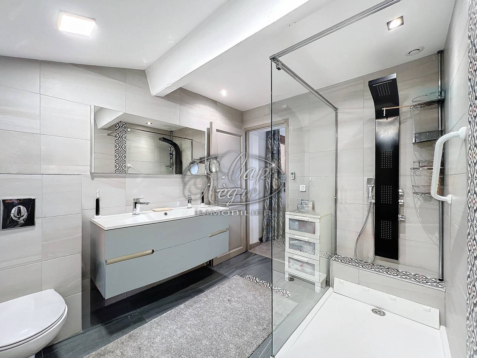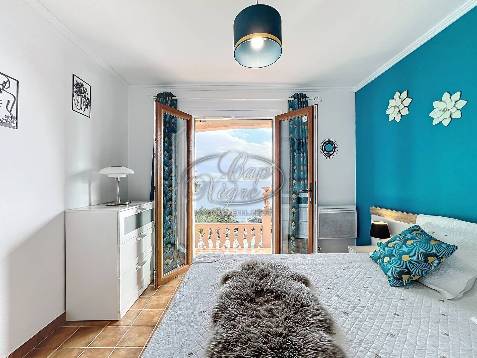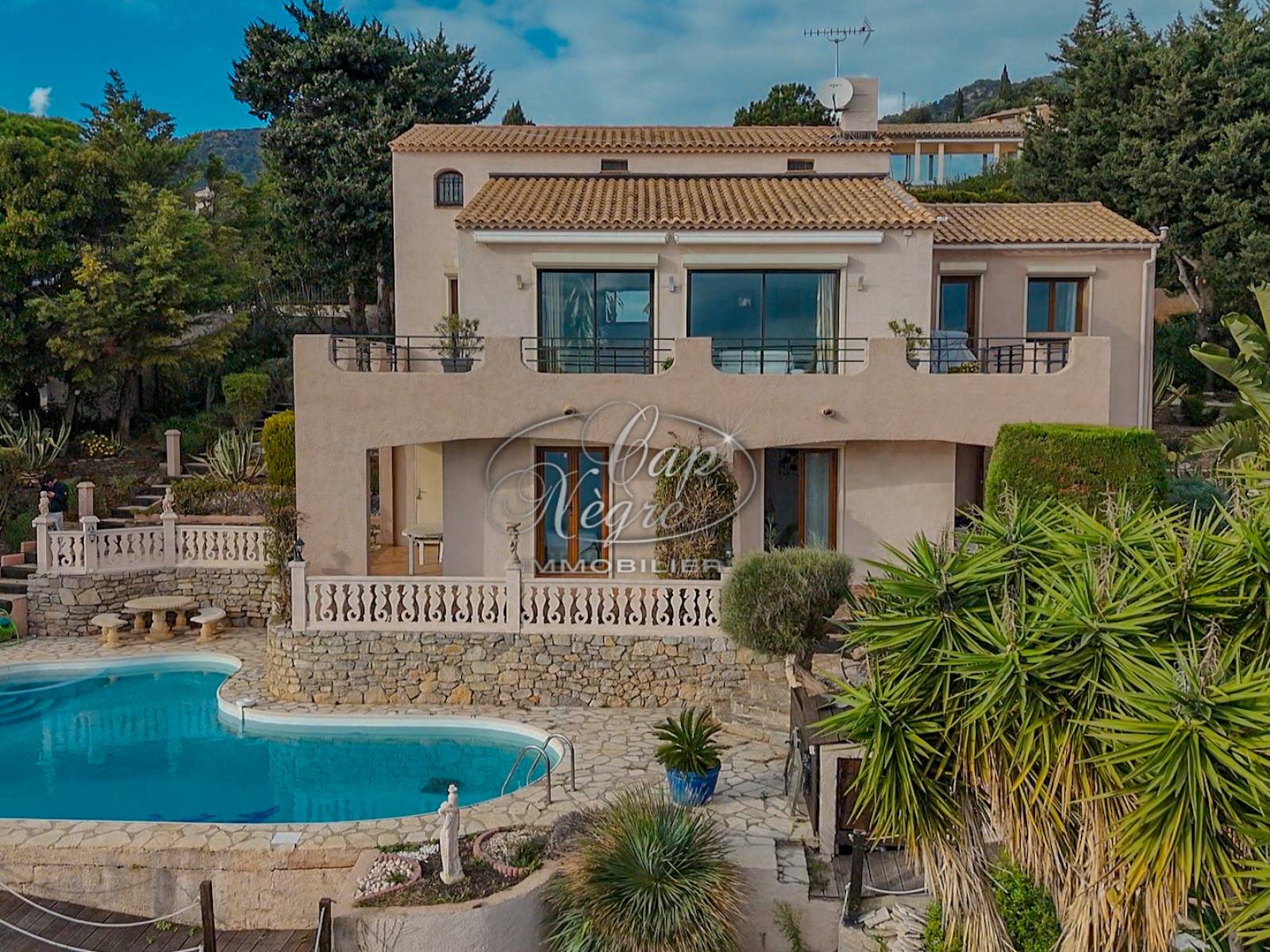 Le séjour lumineux de 40 m², avec sa belle hauteur sous plafond et ses poutres apparentes, est agrémenté d'une cheminée. Vous trouverez une grande terrasse qui offre une vue imprenable sur la mer et les îles. La maison est équipée de la climatisation pour un confort optimal, et la cuisine est entièrement aménagée avec tout l'équipement nécessaire. Les extérieurs, soigneusement aménagés et fleuris, comprennent une piscine de bonne dimension avec un pool house. De plus, toutes les pièces de la maison bénéficient d’une magnifique vue sur la mer.