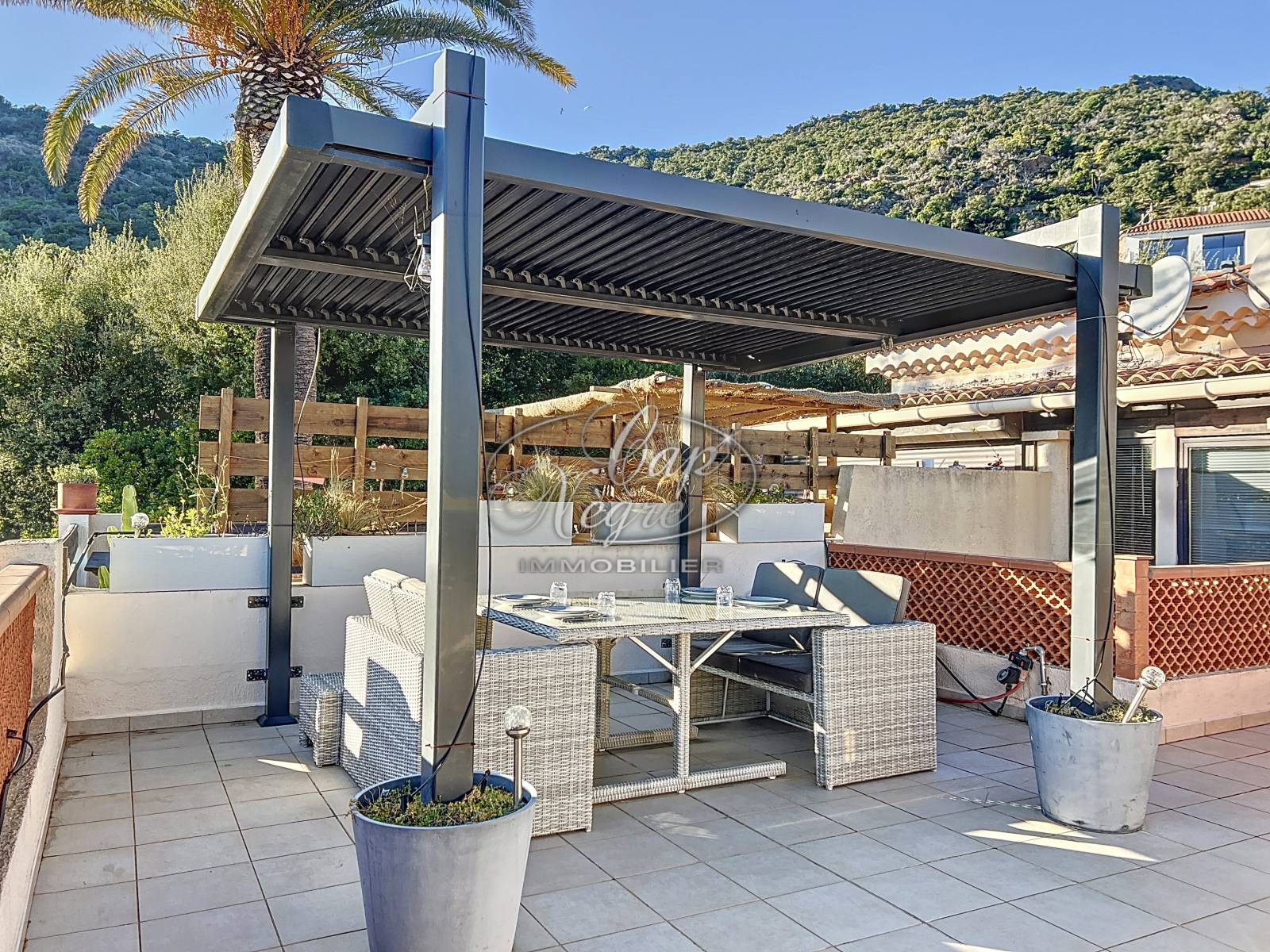 Découvrez ce magnifique appartement de 40m² composé d'une grande terrasse aménagée de 35 m² avec salon de jardin sous la pergola et vue panoramique sur la végétation et la mer.
