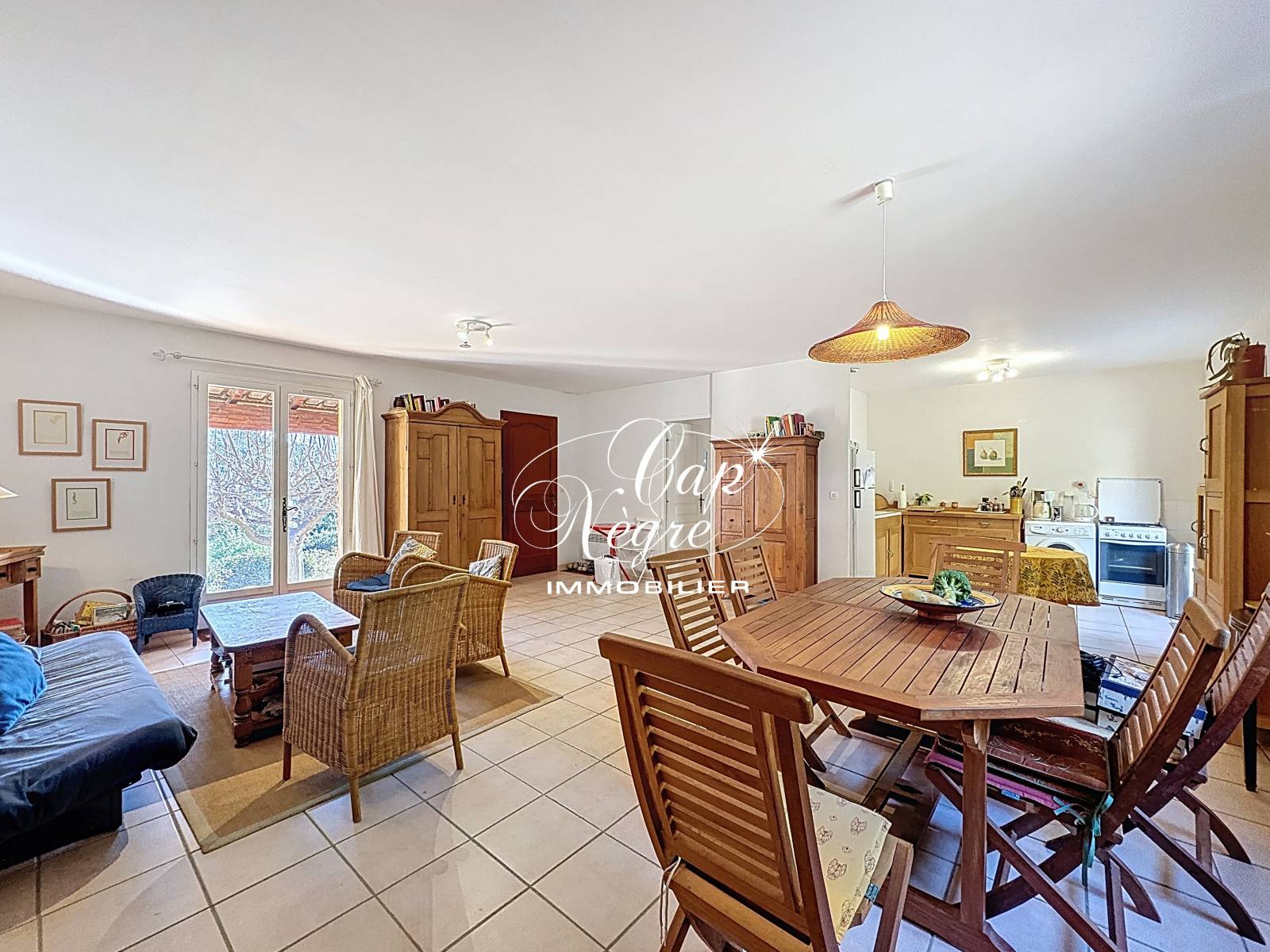 D'une surface habitable d'environ 88,95 m², la maison propose un grand séjour traversant de 47 m² avec cuisine ouverte et salle à manger. Lumineuse et agréable à vivre, cette pièce centrale s'ouvre directement sur deux terrasses exposées sud et nord.