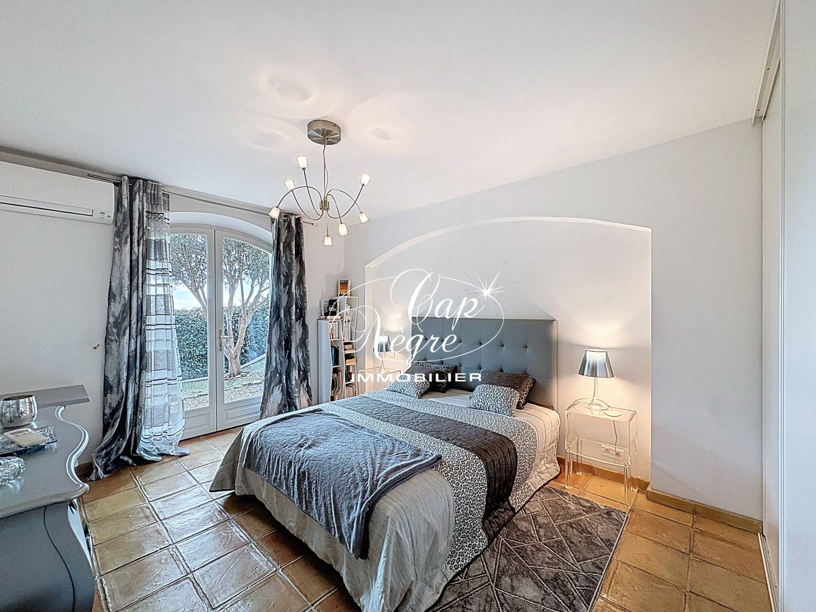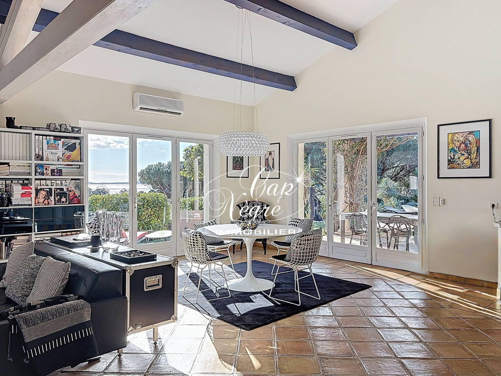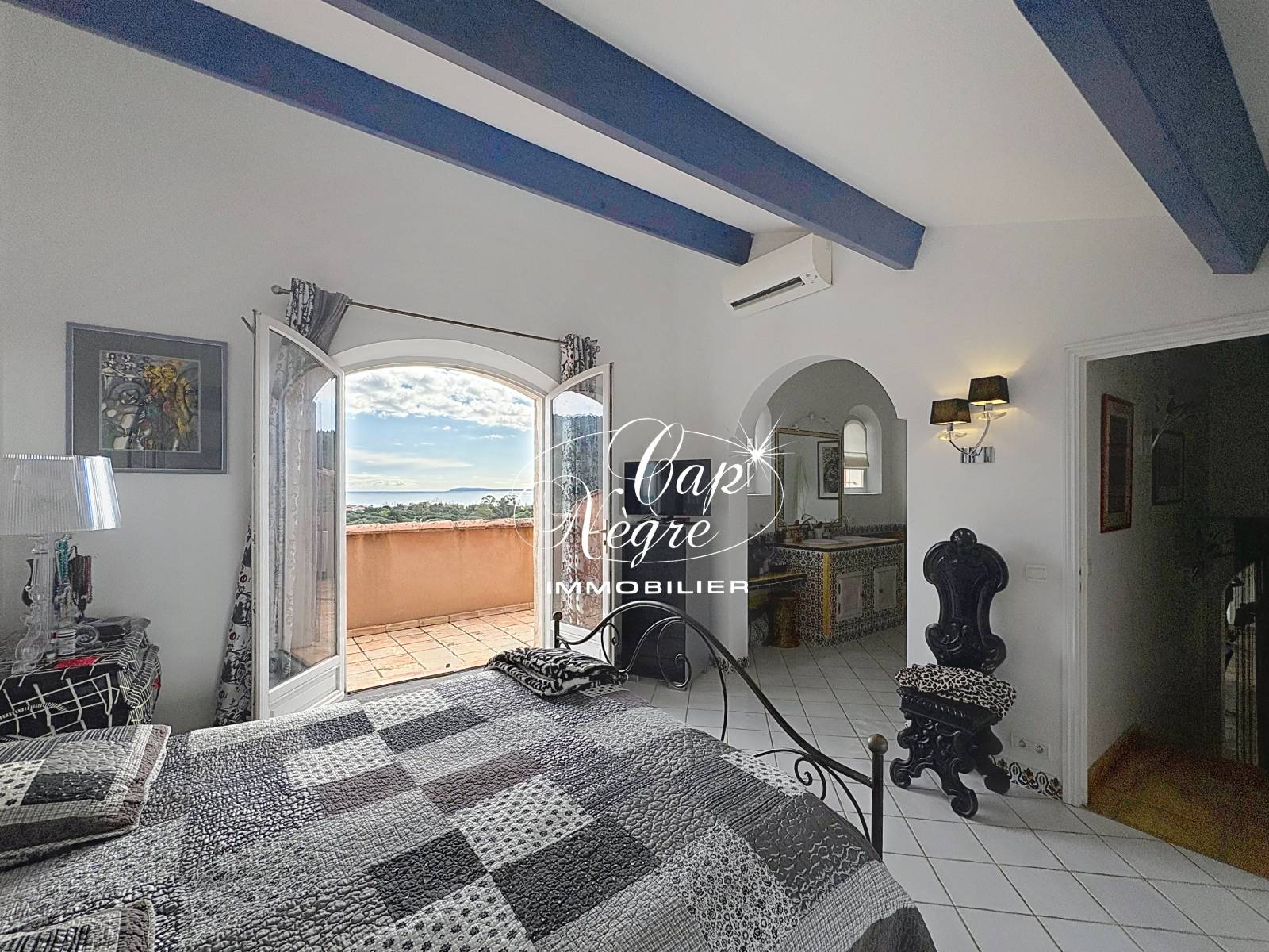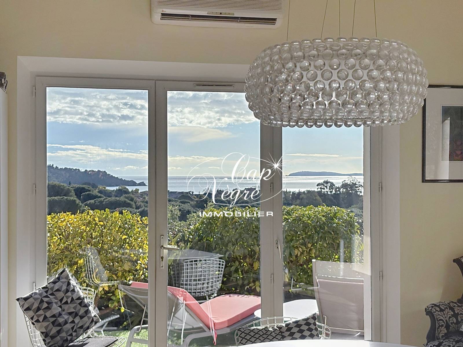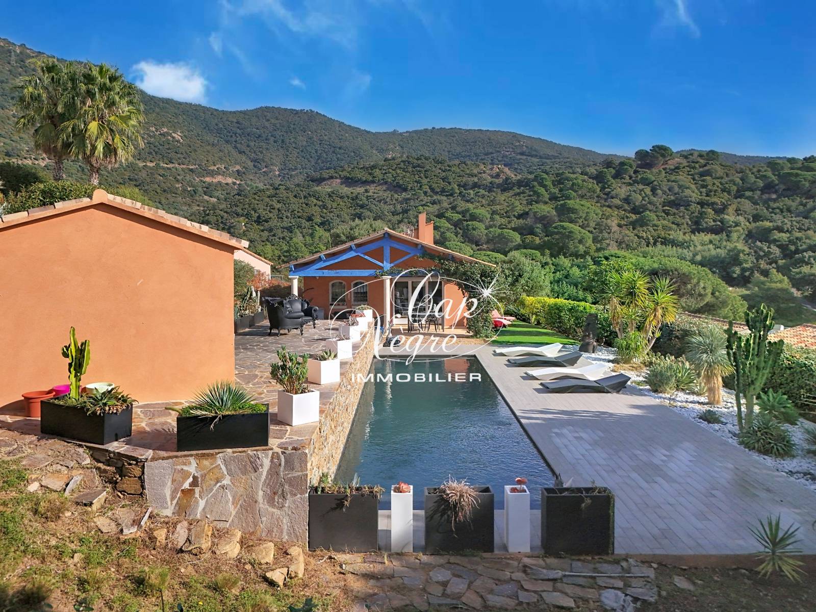 Cette maison construite en 2002, allie élégance et confort moderne : séjour cathédrale lumineux, espace salon avec cheminée contemporaine Focus avec façade Mondrian , salle à manger et sa cuisine ouverte, accès direct à la piscine et au jardin, le tout n'échappant pas à une vue mer exceptionnelle. La végétation est omniprésente et au loin nous apercevons les îles ainsi que la pointe du Cap Nègre.