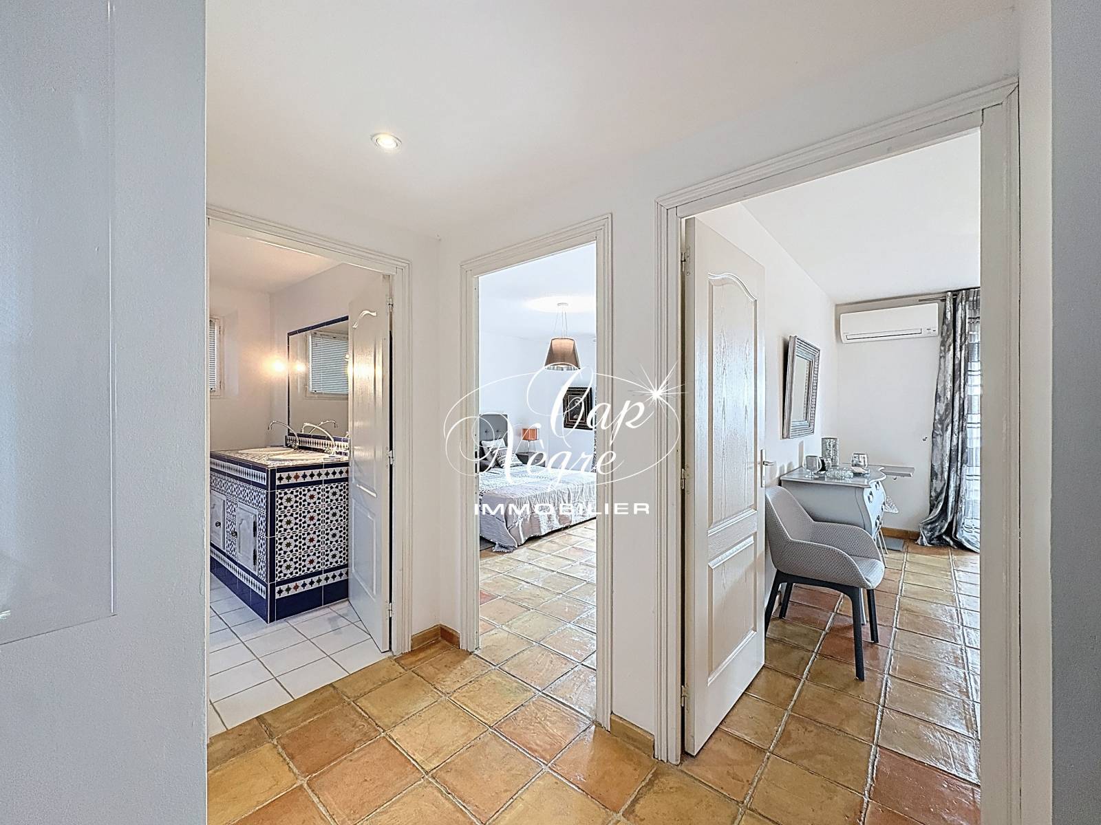 La chambre de maître, espace intime, chaleureux et bien pensé dispose d'une grande penderie, et d'une salle de bain avec des carreaux peints à la main. Elle dispose de sa terrasse privée, plein Sud, face à la mer. Ensuite, deux magnifiques chambres avec vue mer, situées en rez-de-jardin avec salle d’eau et WC séparé. Possibilité d'une 3ème salle d'eau.