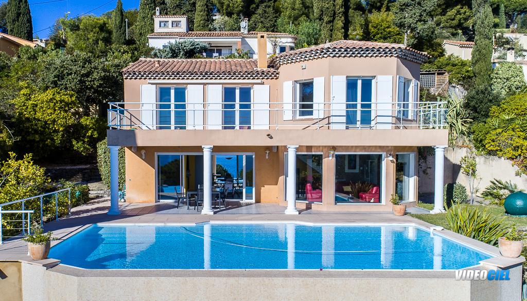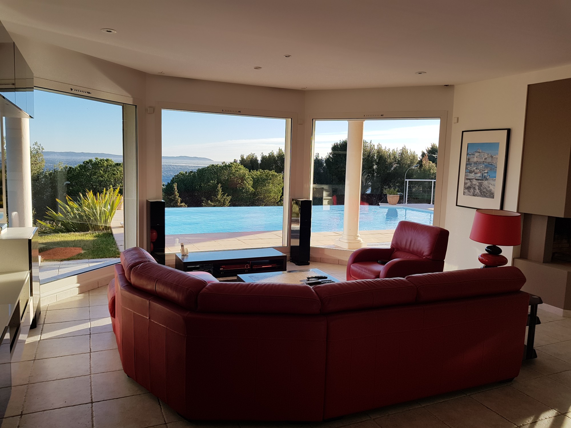 Idéalement située à quelques pas de la plage d'Aiguebelle, villa sur deux niveaux d'environ 230m² bénéficiant d'une vue mer panoramique. La maison dispose d'un bel espace de vie avec séjour, salle à manger, cuisine ouverte, 4 chambres, une salle d'eau, une salle de bain, wc, buanderie, solarium. Cave, double garage. Piscine à débordement. Terrain arboré et paysagé de 1230m². A voir! Prix : 1 700 000€ Honoraires inclus5%. Charge acquéreur.