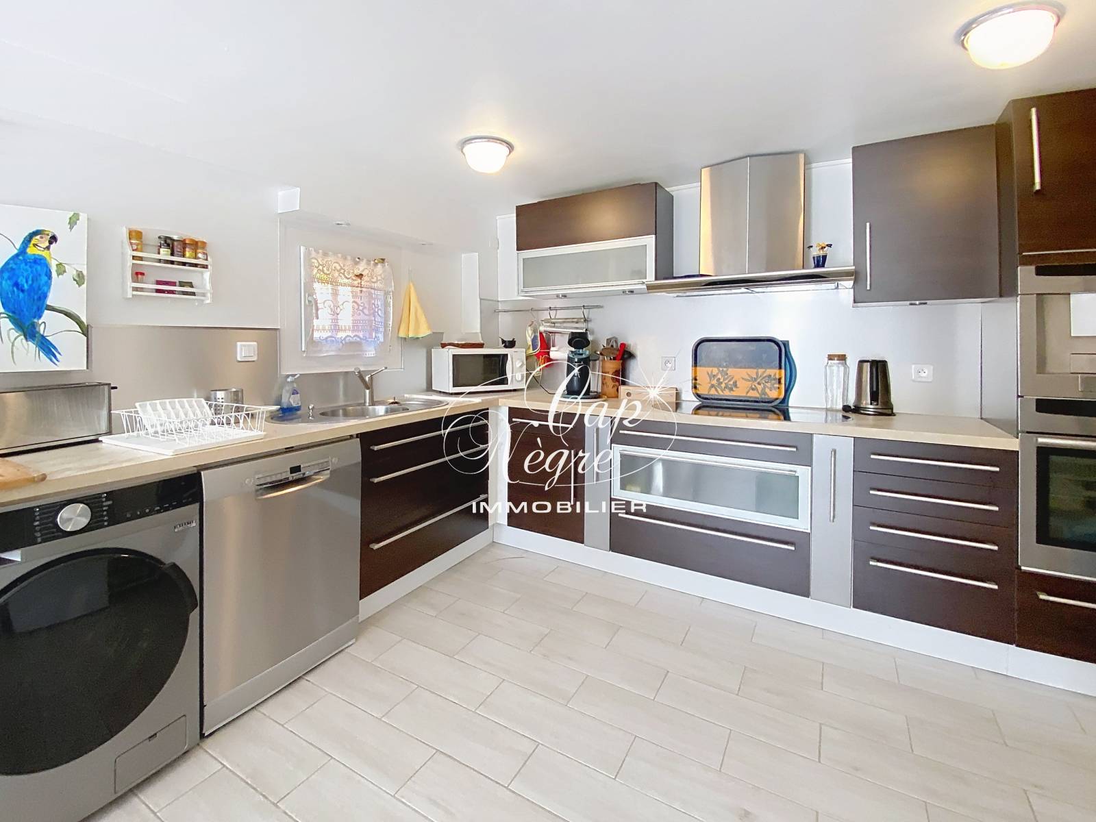 Au rez-de-chaussée : un bel espace de vie lumineux, avec cuisine ouverte entièrement équipée, ouvrant sur une large terrasse privative aménagée avec une cuisine d’été intégrée, une douche extérieure et des toilettes.