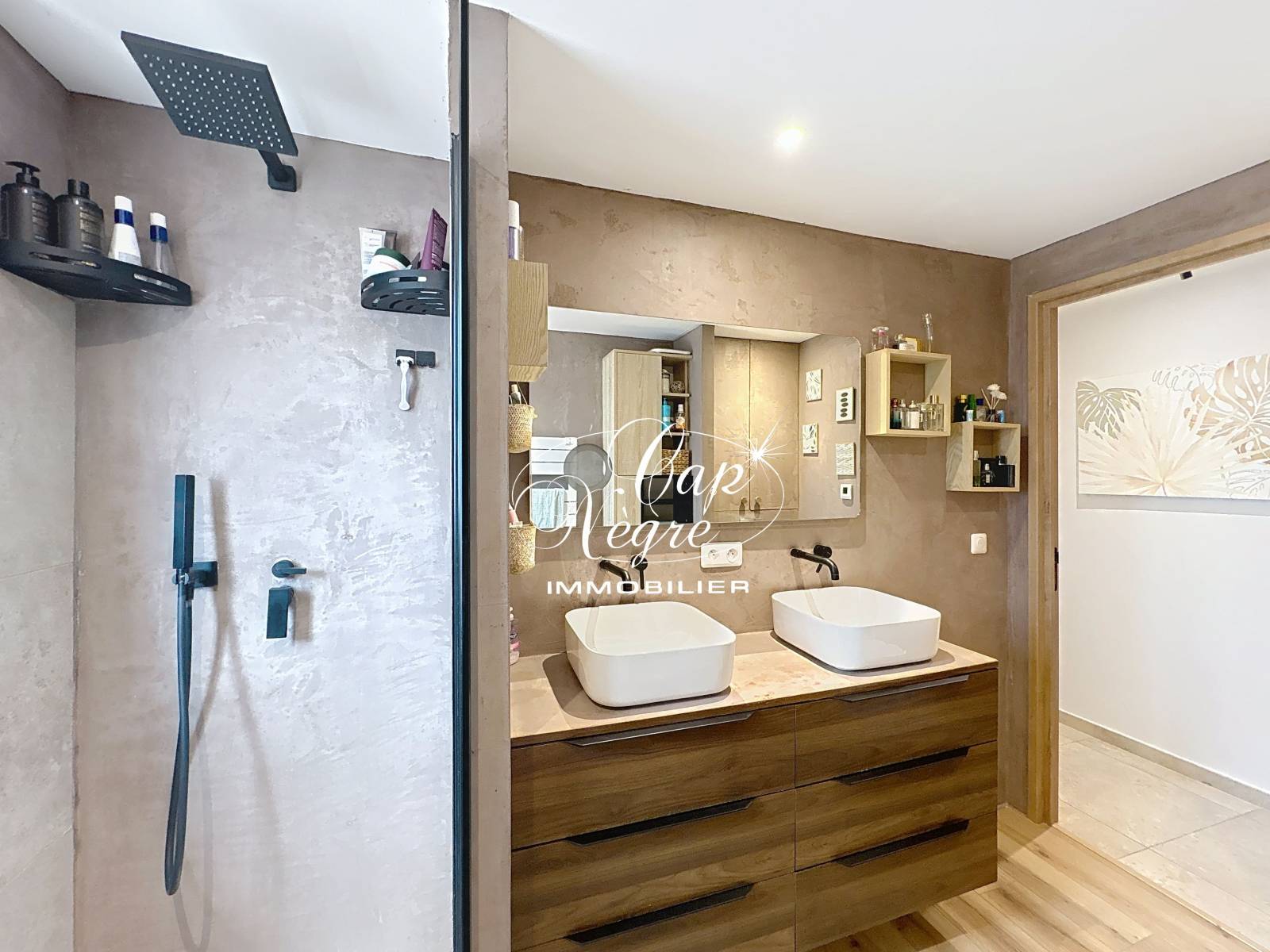 Un escalier élégant mène à l’étage où deux chambres baignées de lumière s'y trouvent. La première de presque 11 m² s’ouvre sur le panorama verdoyant du domaine, et la seconde de 8 m² offre une fraîcheur idéale. Entre elles, une salle d’eau habillée de béton ciré offre une douche à l’italienne et un meuble avec double vasque. Chaque recoin a été pensé pour offrir rangements et fonctionnalité, jusqu’aux placards intégrés.