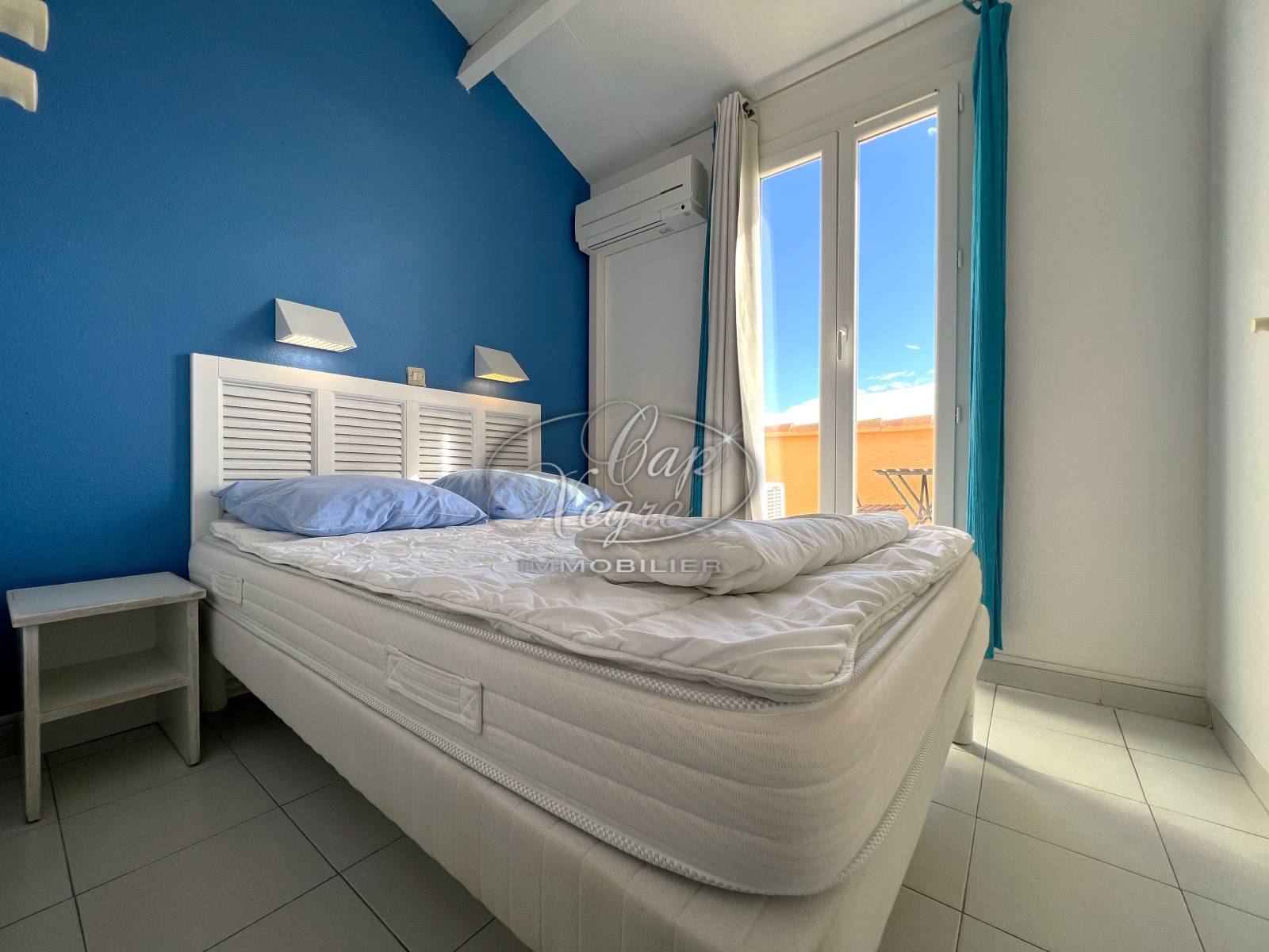 Au niveau supérieur, une chambre double vous invite à profiter d'une vue panoramique depuis la terrasse tropézienne. Une salle de bains avec WC ajoute une touche d'intimité à cet espace exclusif.