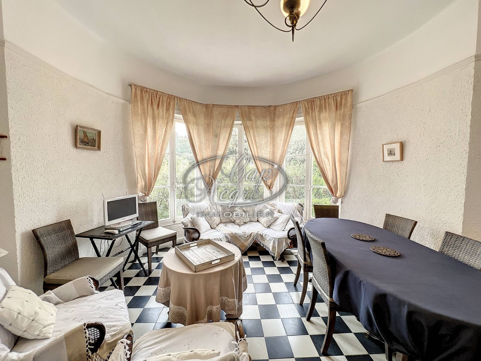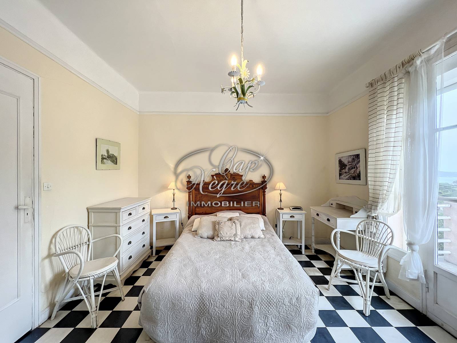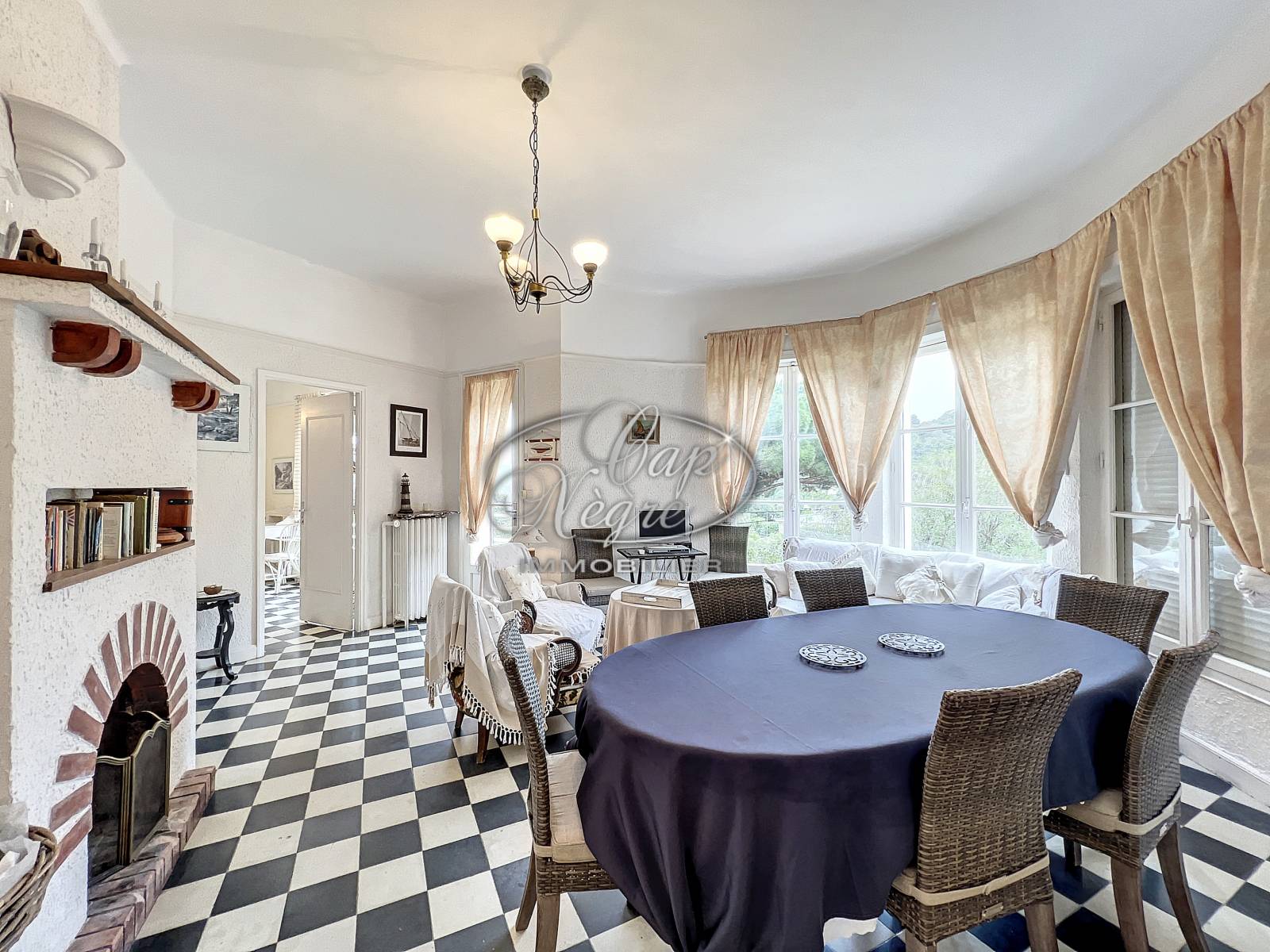 - A l'étage : entrée avec placard, séjour lumineux dans une rotonde avec de grandes ouvertures, accès terrasse vue mer, cheminée d'époque en état de fonctionnement, chambre I avec lavabo, chambre II avec accès terrasse, salle de bains, WC séparé et couloir de distribution.