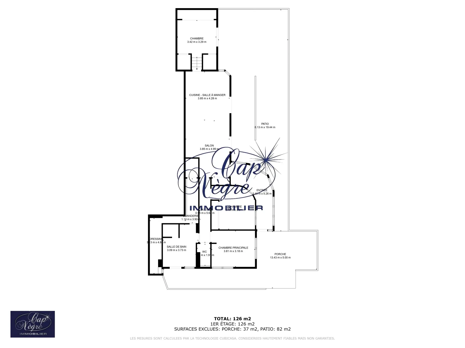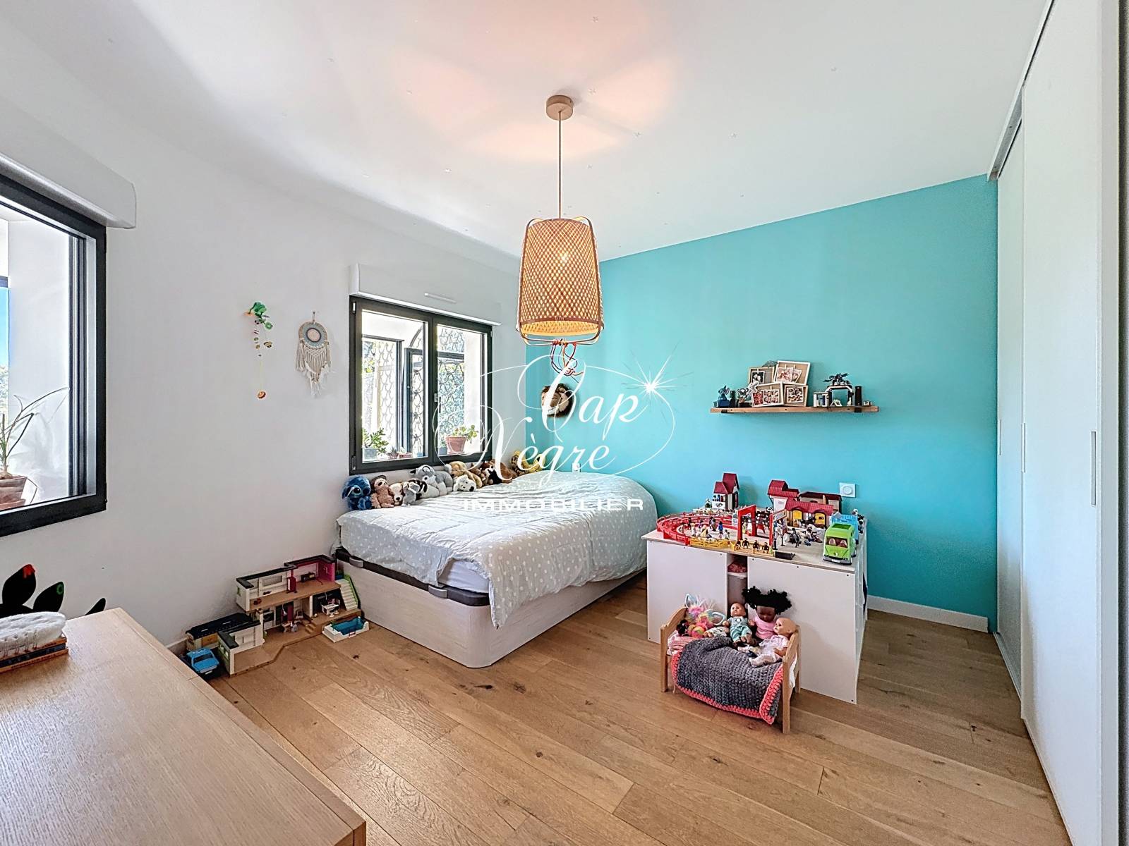 À l’intérieur, l’entrée se fait par un élégant couloir en arrondi qui mène au salon et à la cuisine salle à manger, chacun ouvert sur une terrasse. Depuis la salle à manger, quelques marches descendent vers une première chambre avec placards, donnant sur une terrasse aménagée en salon de jardin.
