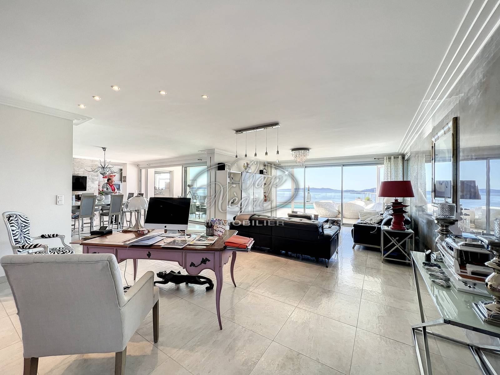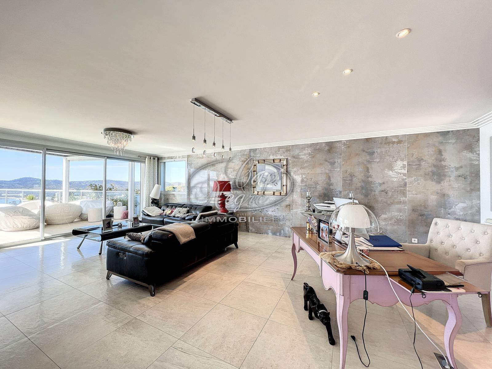 Au niveau principal : une cuisine équipée suivie du double séjour, l’ensemble baigné de lumière s’ouvre sur une large terrasse au sud avec la piscine et ses plages ; 2 chambres avec salle d'eau et dressing.