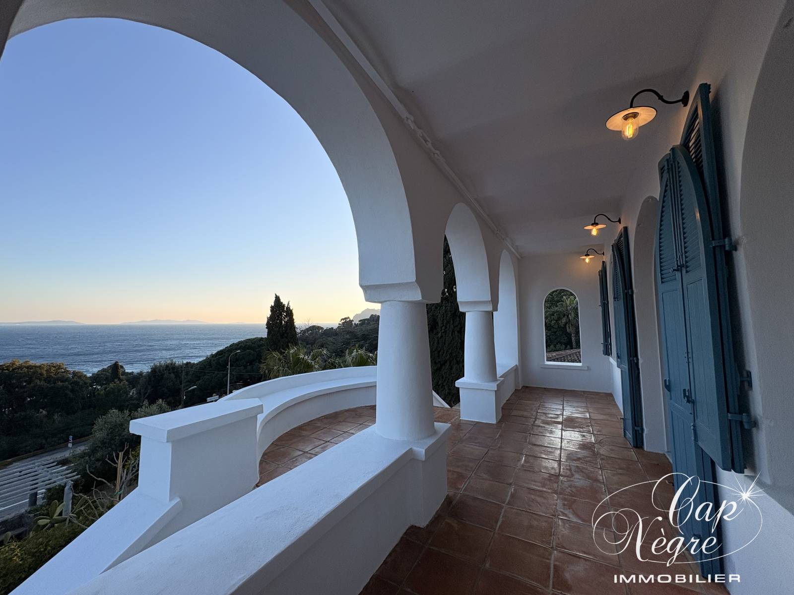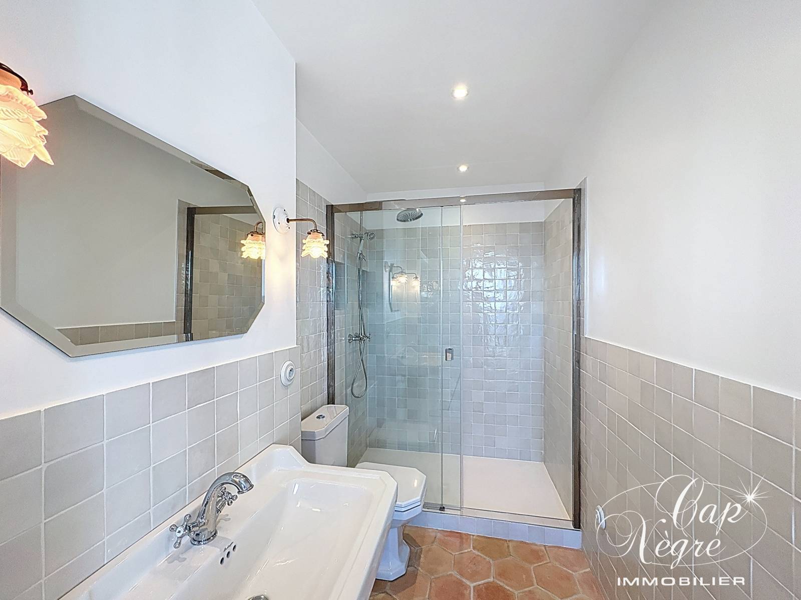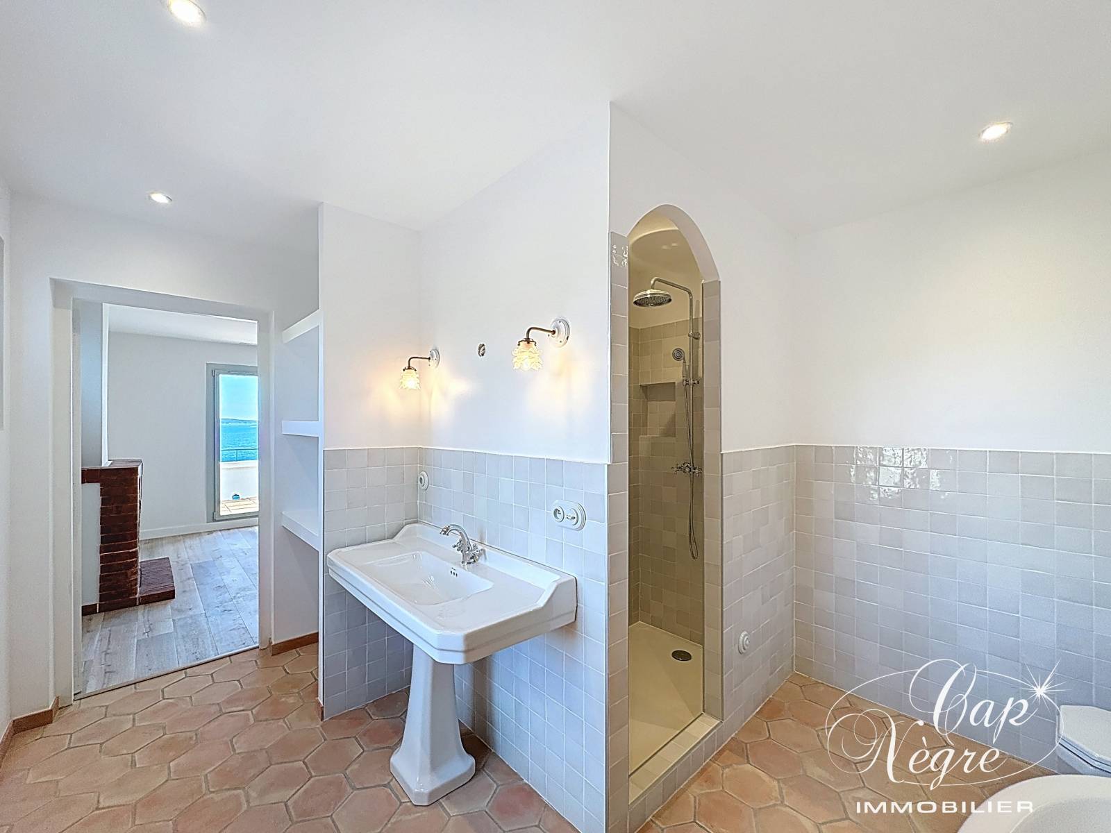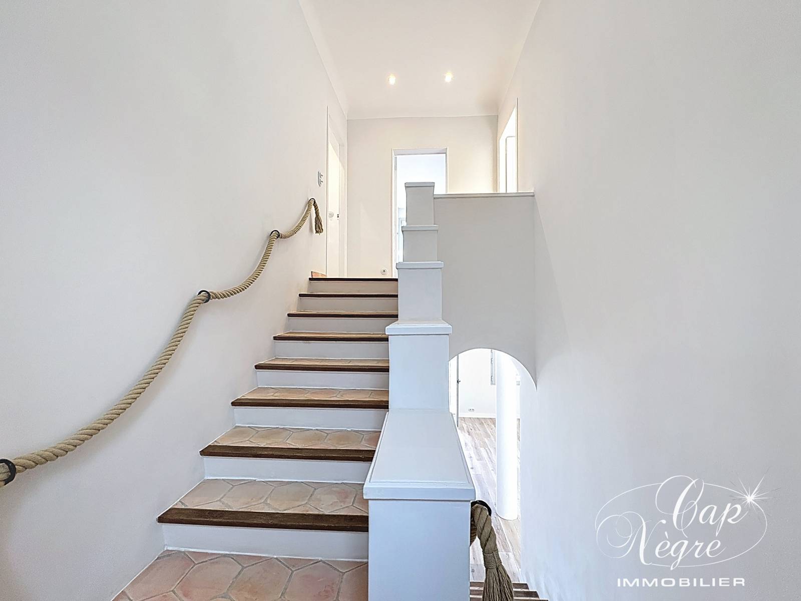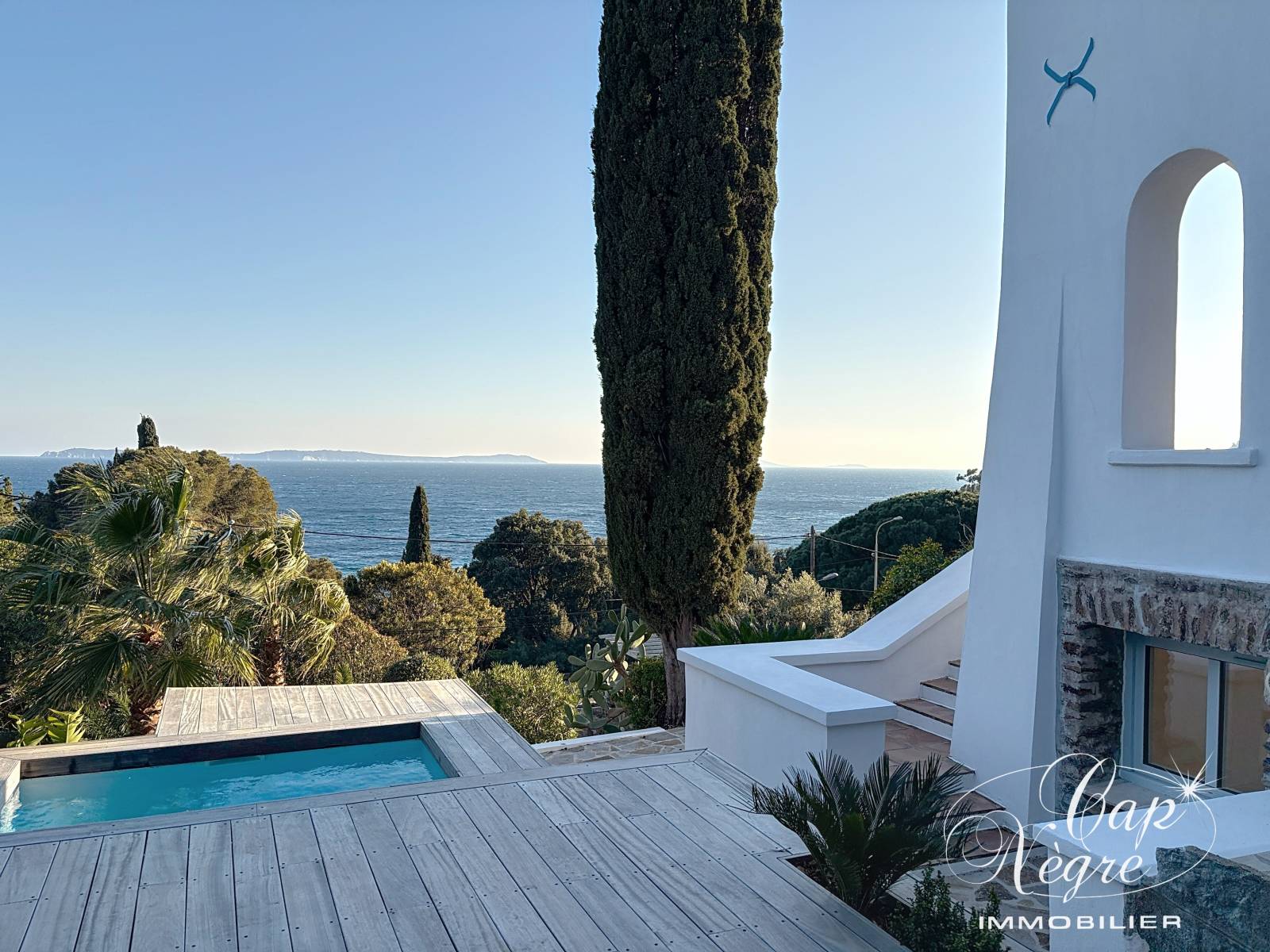 À l'étage , trois vastes chambres, chacune dotée de sa salle d'eau privative dont une avec sa baignoire, s'ouvrent sur une terrasse offrant une vue incroyable sur la baie du Canadel.