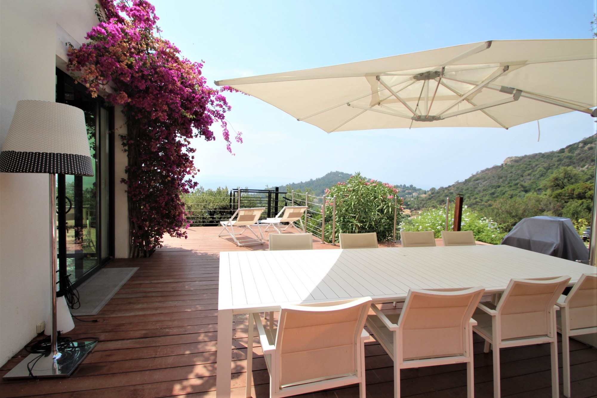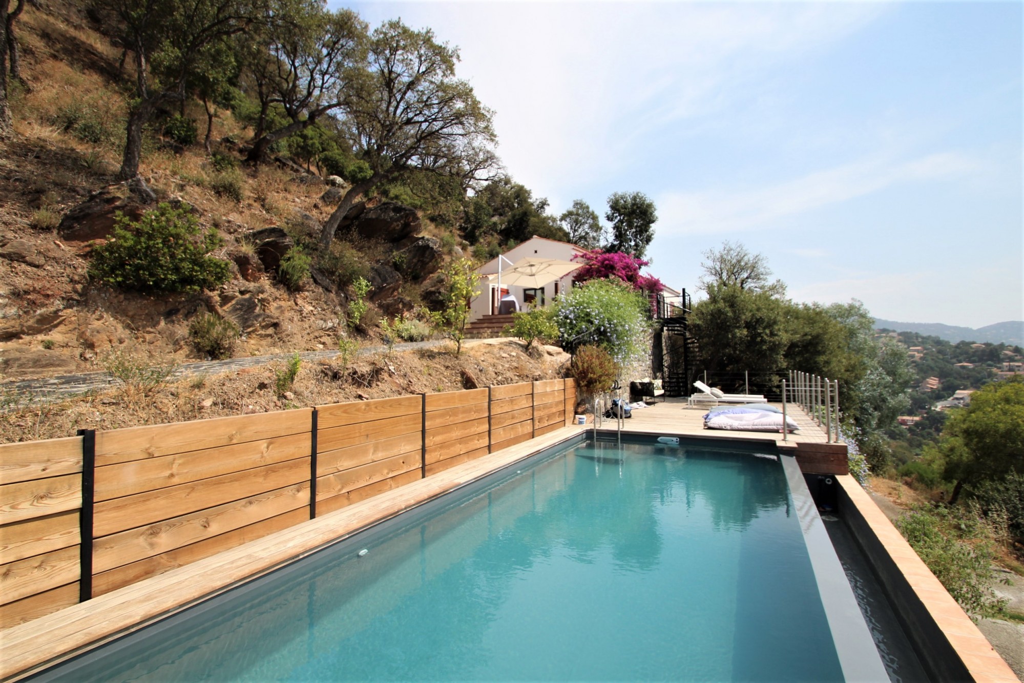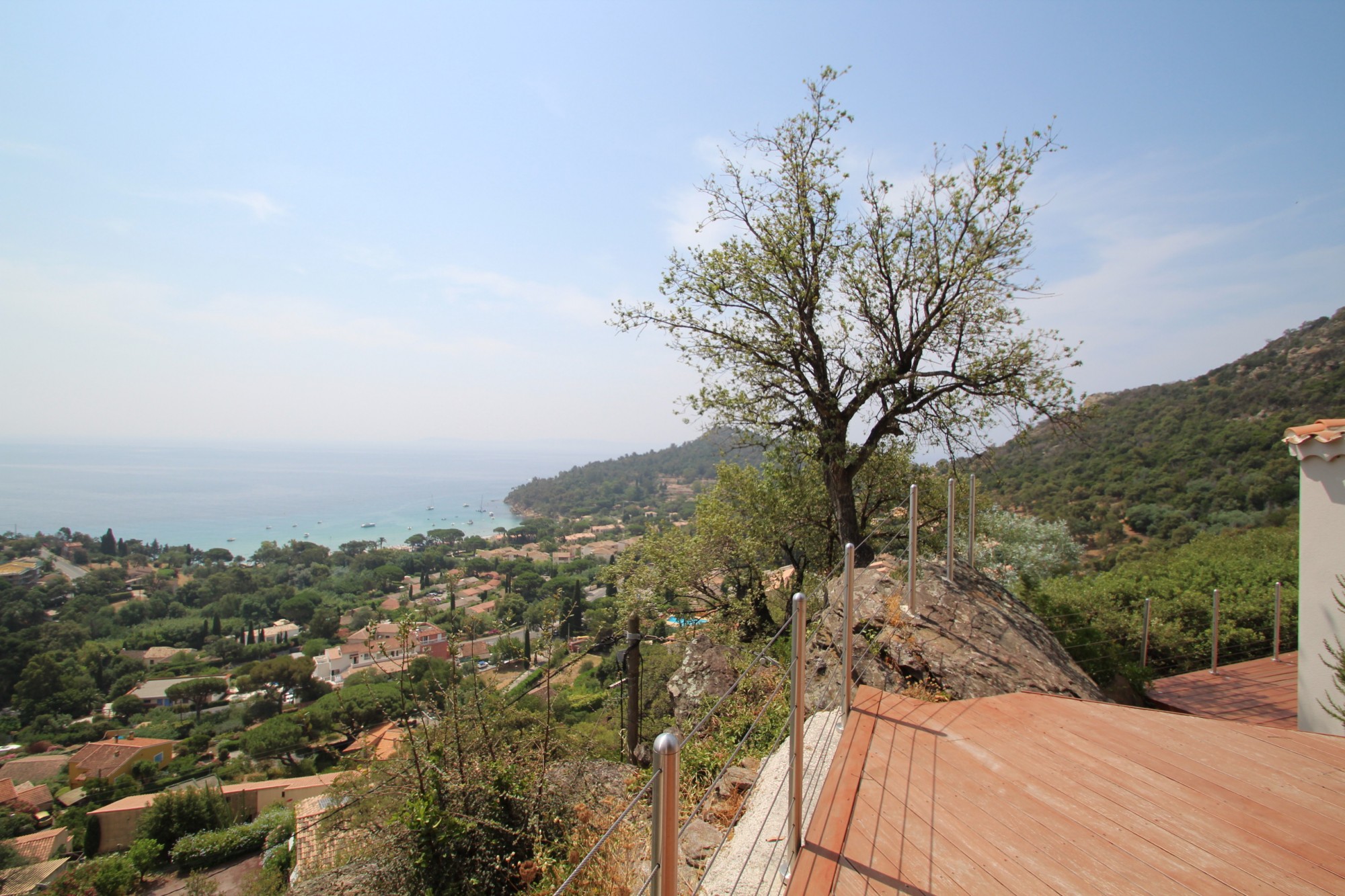 Dernière maison sur les hauteurs de Pramousquier, cette villa de plain-pied entièrement rénovée en 2018 est sur un terrain de 2000 m² en partie constructible. Elle comprend 4 chambres avec leur salle d'eau, une cuisine parfaitement équipée ouvrant sur une grande salle à manger et un séjour spacieux. Une immense terrasse en bois entoure la maison.