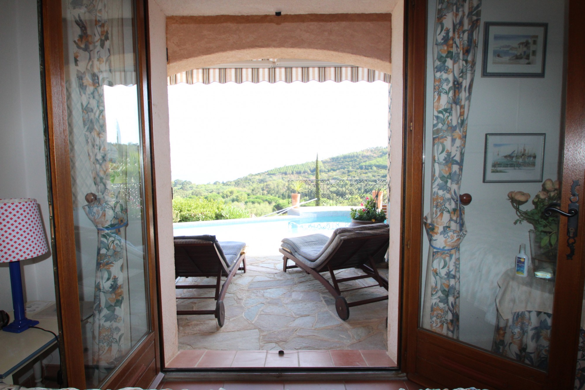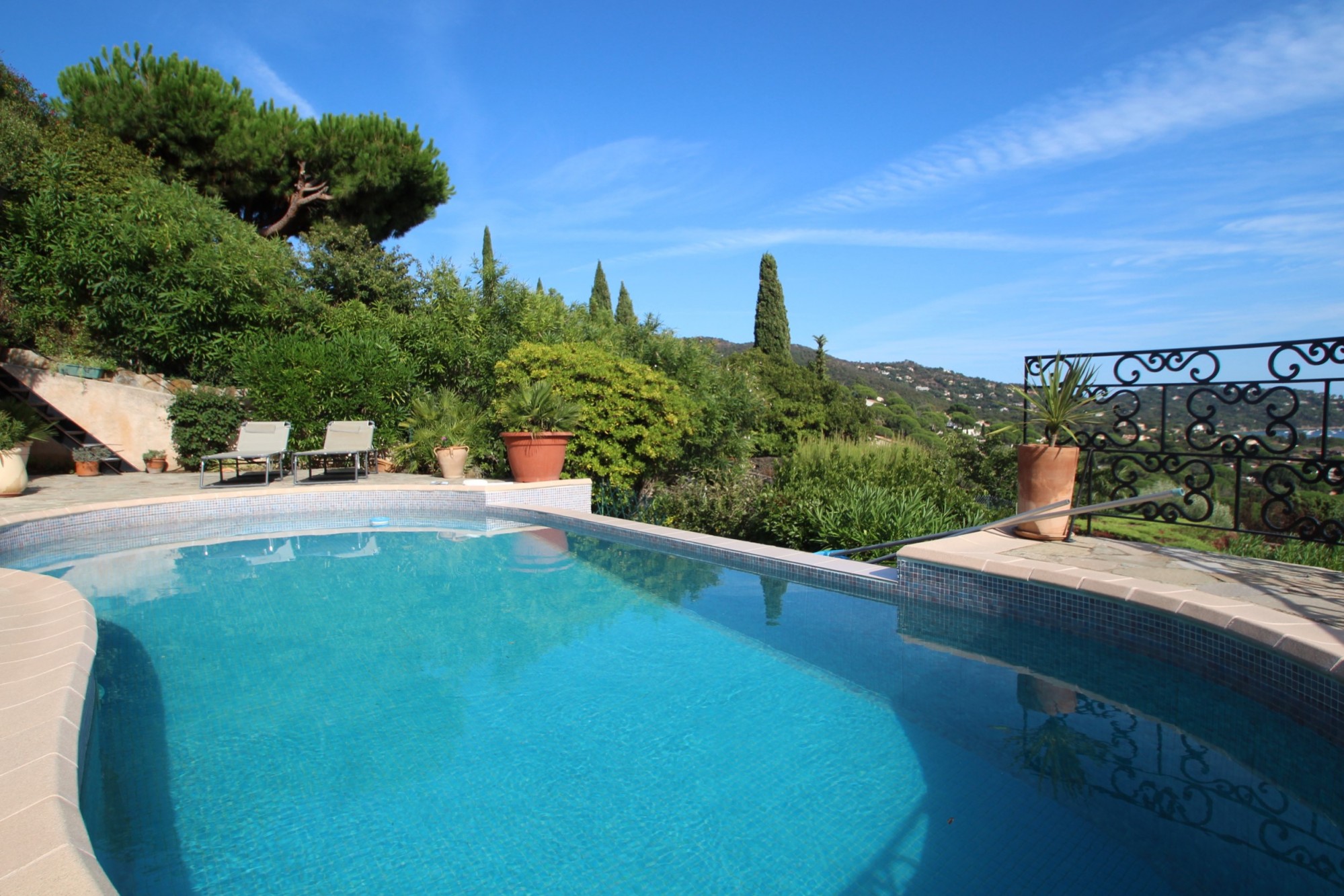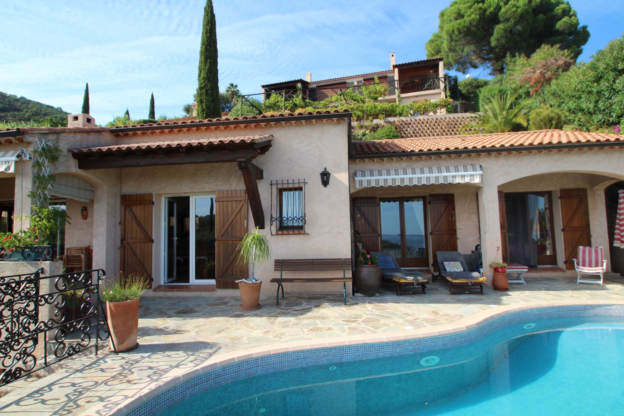 - à l'étage: un spacieux séjour avec cheminée donnant sur la terrasse principale et la piscine à débordement, climatisation réversible, cuisine maçonnée avec des matériaux de qualité ouvrant sur une petite terrasse avec barbecue, chambre I climatisée avec placard et salle d'eau, chambre II climatisée avec salle d'eau et grand placard.