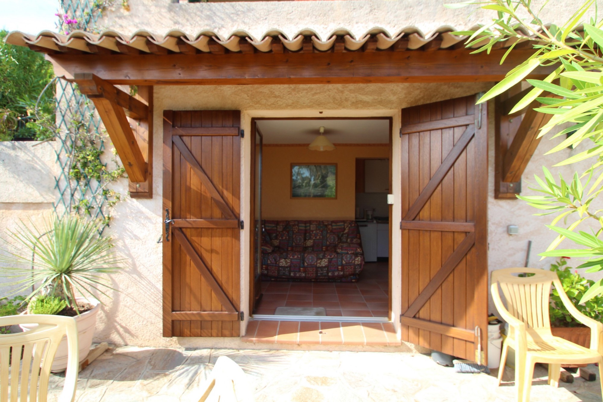 - au rez de chaussée: un escalier intérieur relie les deux niveaux, atelier avec établi, cave creusée dans la roche et un studio indépendant équipé avec terrasse.