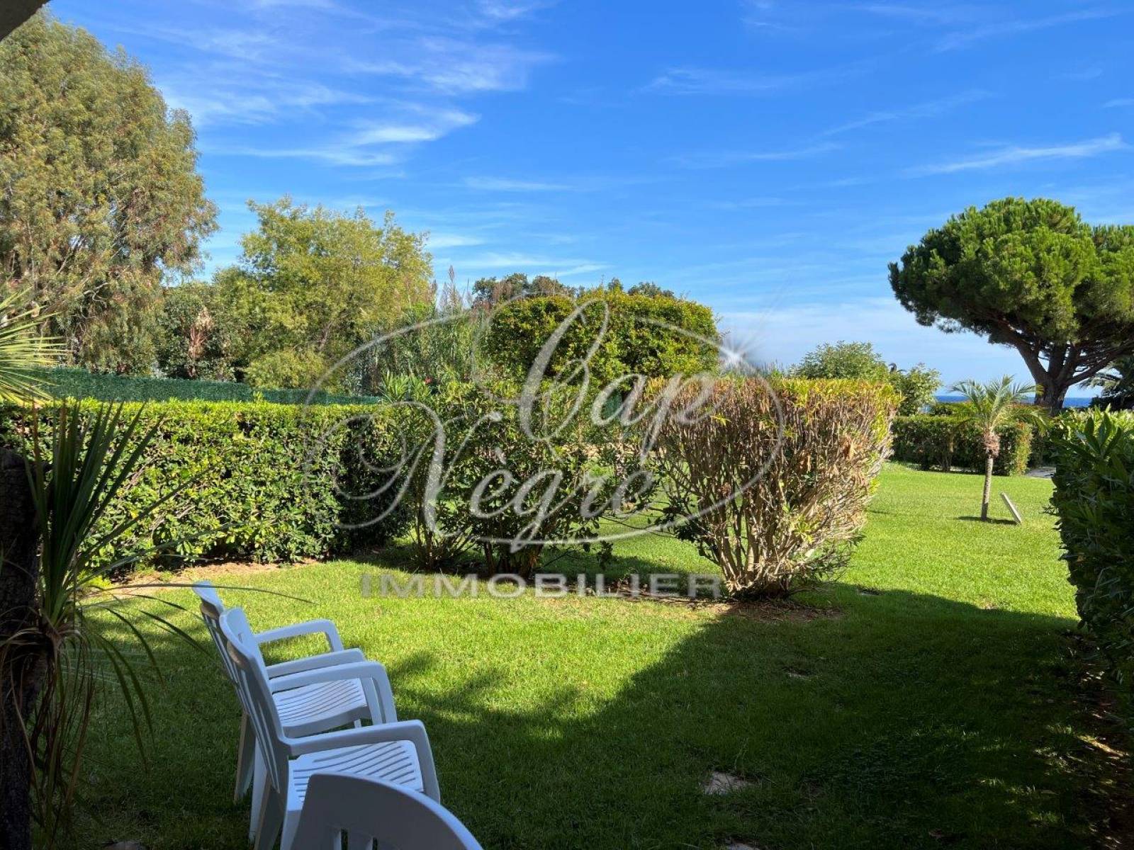 sur le séjour qui donne sur une terrasse couverte puis le jardin ; l'ensemble dispose d'une vue sur la verdure puis sur la mer.