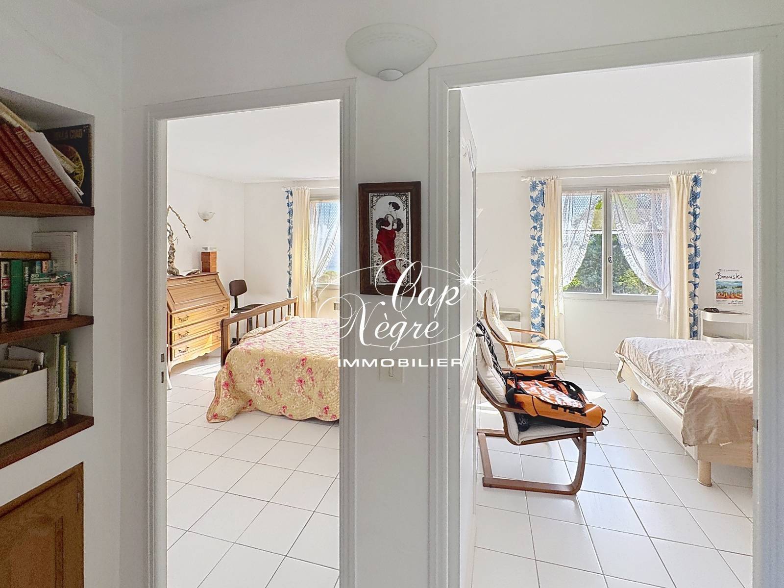 Dès l’entrée, vous trouverez un vestiaire, la cuisine séparée et aménagée attenante au séjour lumineux agrémenté d’une cheminée, tandis que la véranda prolonge l’espace de vie et offre un tableau permanent sur la mer et la végétation. Deux chambres, une salle de bains, des WC séparés et de nombreux rangements complètent ce niveau principal.