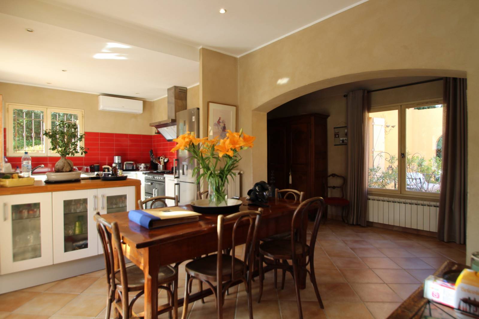 - La villa principale se compose d'un séjour avec cheminé et cuisine ouverte, le tout ouvrant au nord sur le patio, au sud sur la terrasse prolongée par la piscine, son pool house ainsi que le jardin joliment arboré.