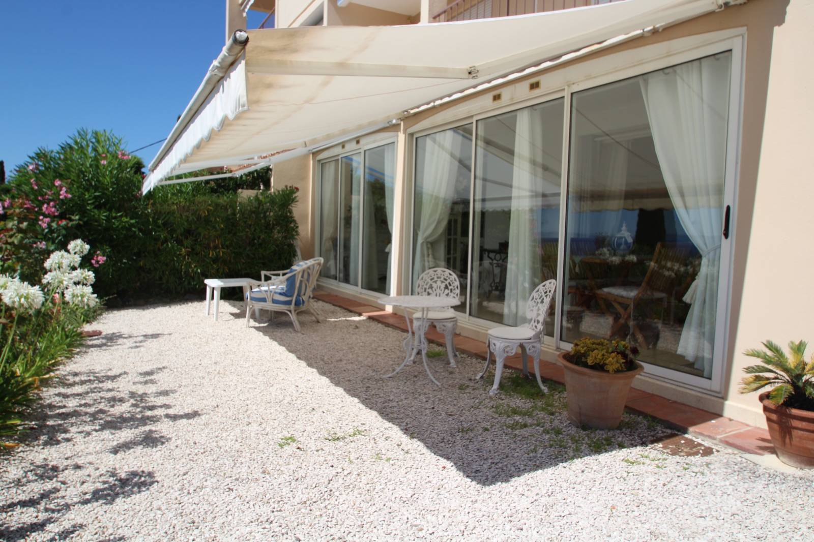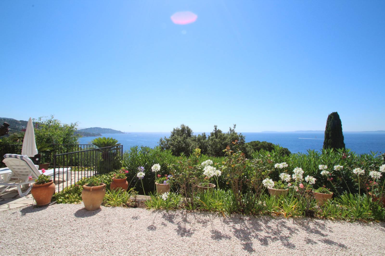 Jardin et terrasses parfaitement entretenus, belle végétation et vue imprenable sur la mer.