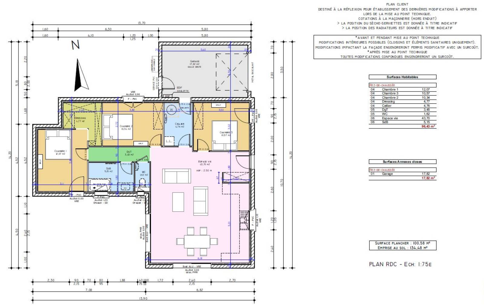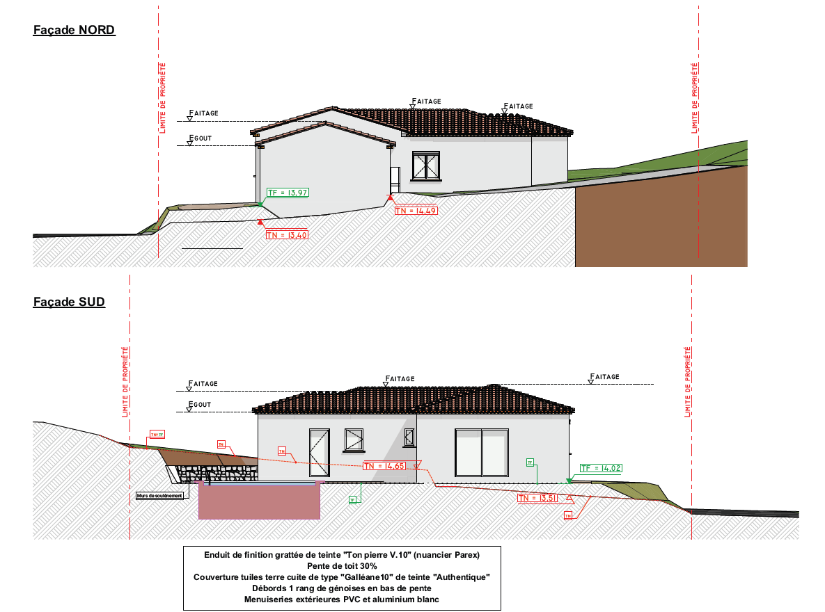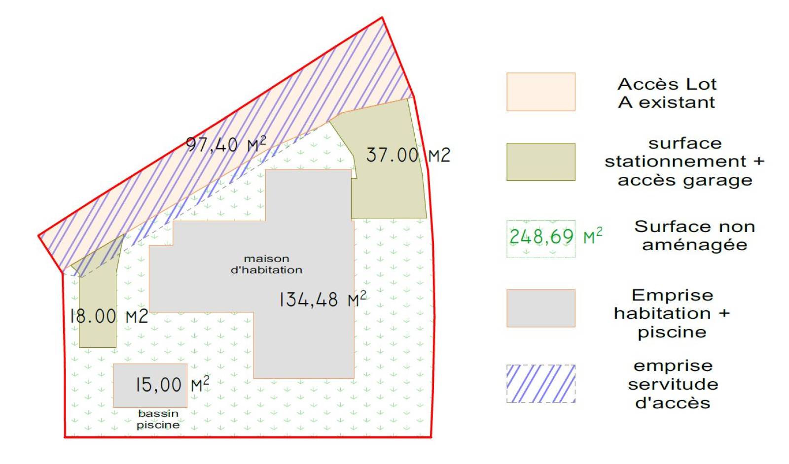 Un permis de construire accepté et purgé de tous recours autorise la construction d'une villa de plain-pied (96,43m²) avec garage attenant (17,82m²) et piscine (5x3).