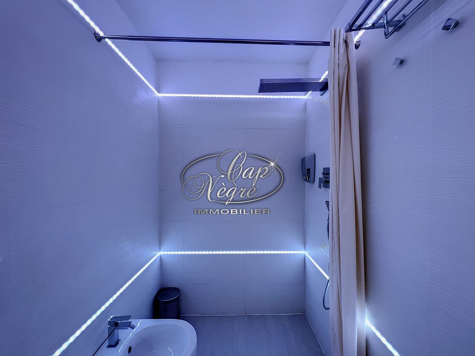 La salle d'eau moderne est équipée d'un WC, d'un bidet et d'un système d'éclairage LED contemporain.