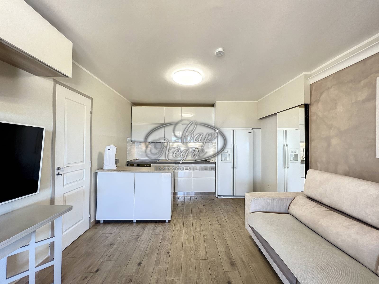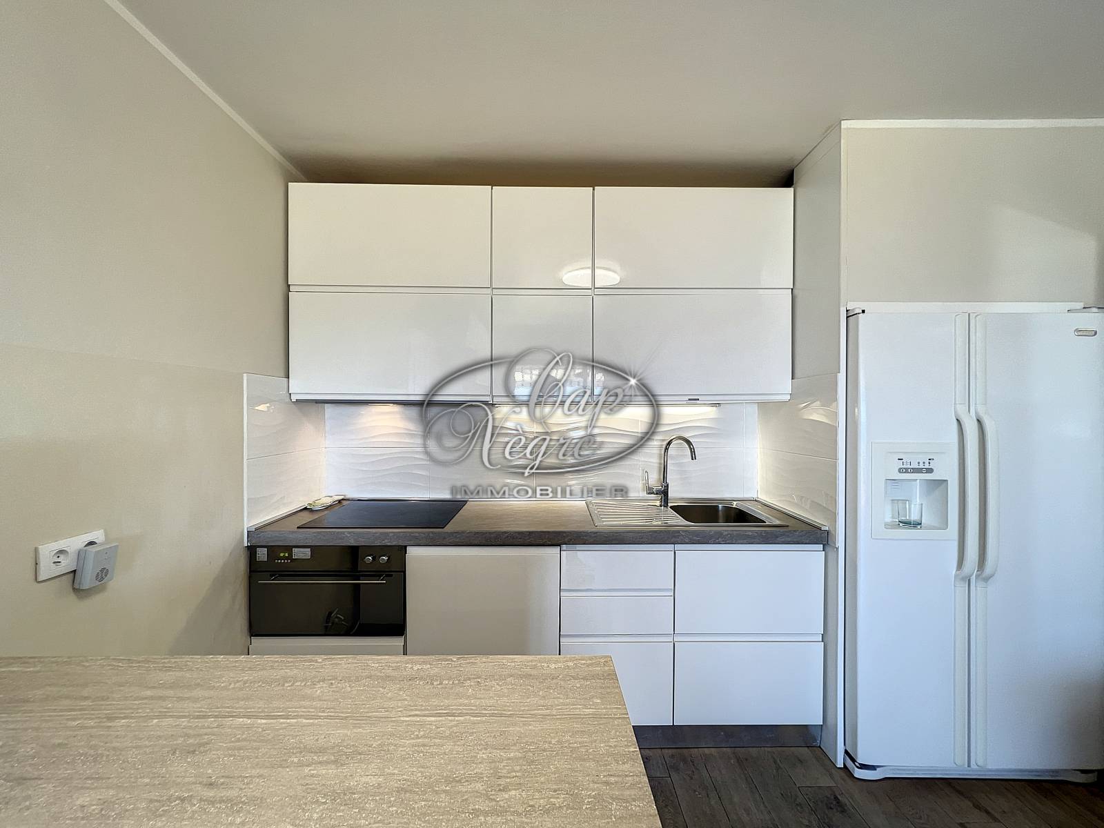 Le salon, lumineux et aéré, partage le même espace que la cuisine. Une table rétractable permet les repas en intérieur, tandis que la cuisine ouverte entièrement équipée, ravira les amateurs de gastronomie.