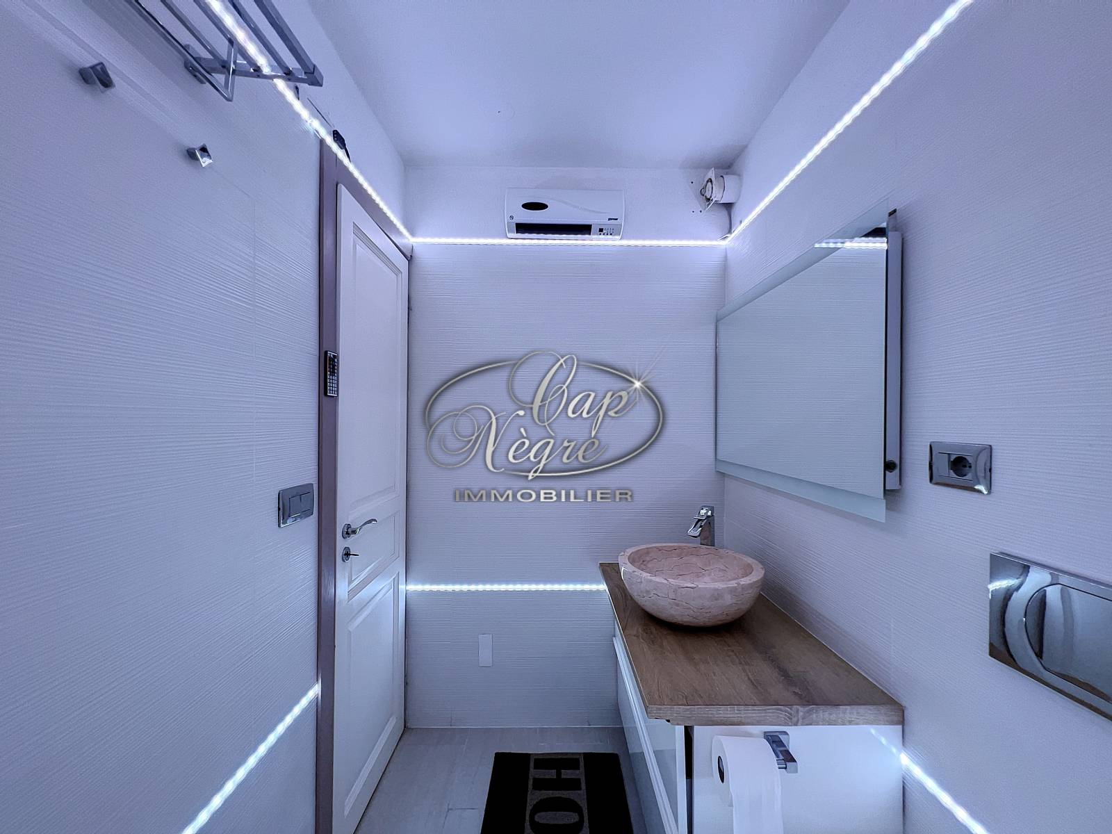 La salle d'eau moderne est équipée d'un WC, d'un bidet et d'un système d'éclairage LED contemporain.