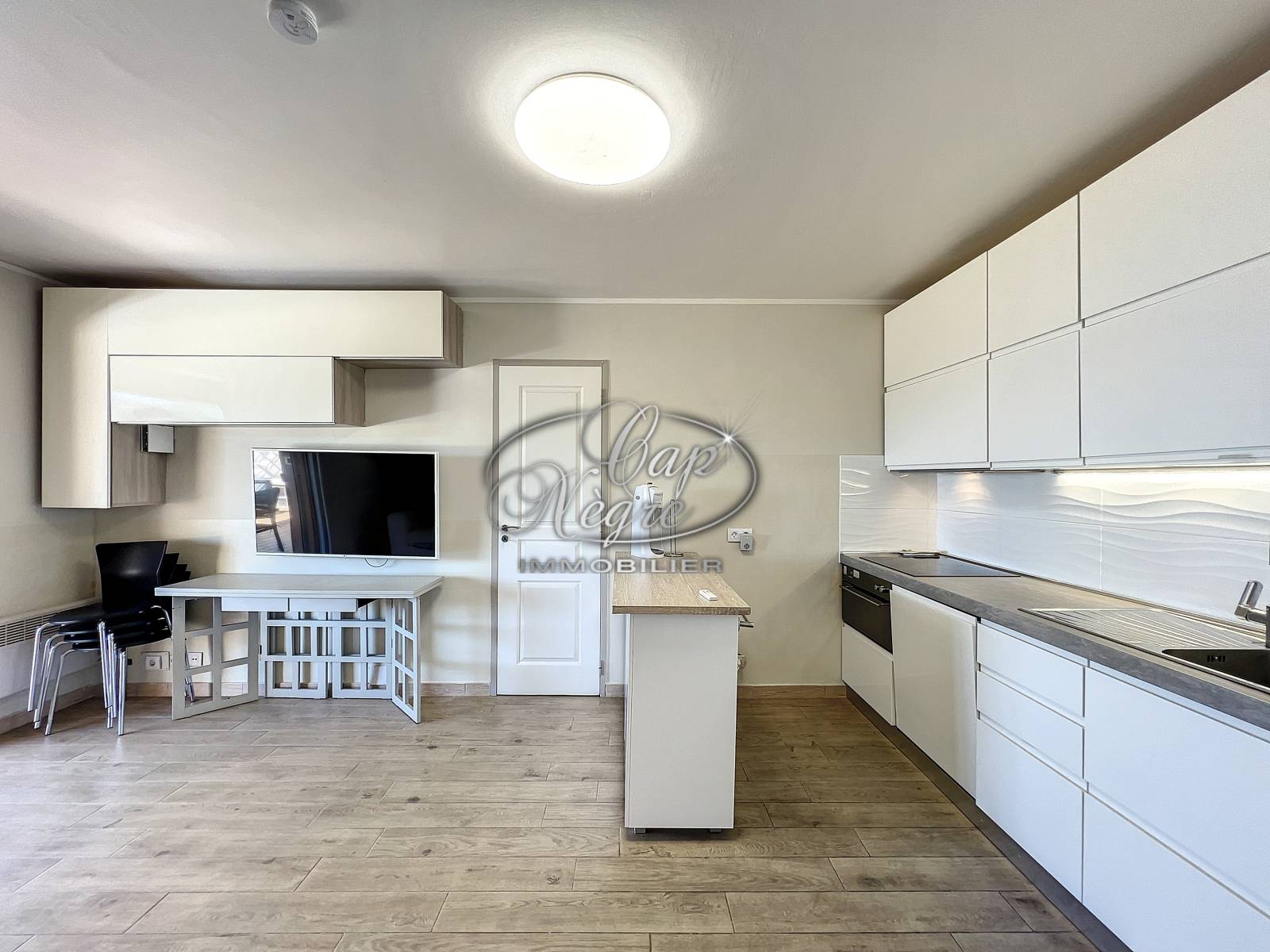 Le salon, lumineux et aéré, partage le même espace que la cuisine. Une table rétractable permet les repas en intérieur, tandis que la cuisine ouverte entièrement équipée, ravira les amateurs de gastronomie.