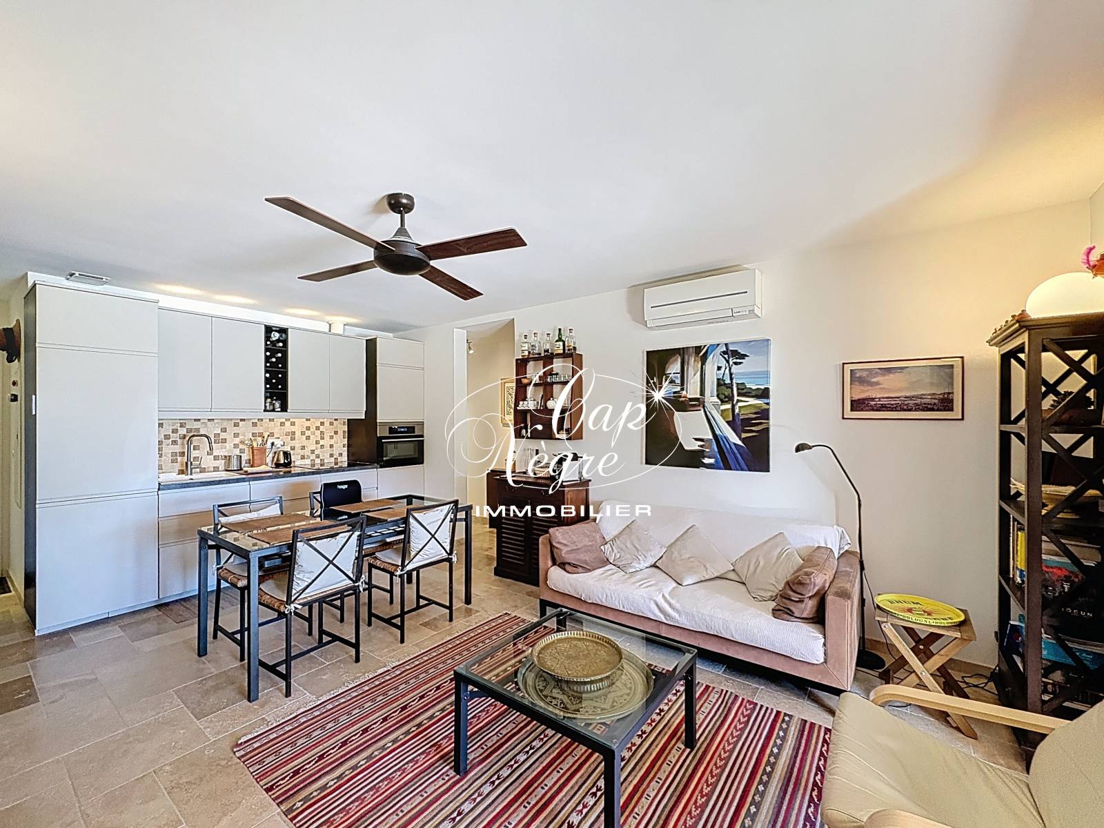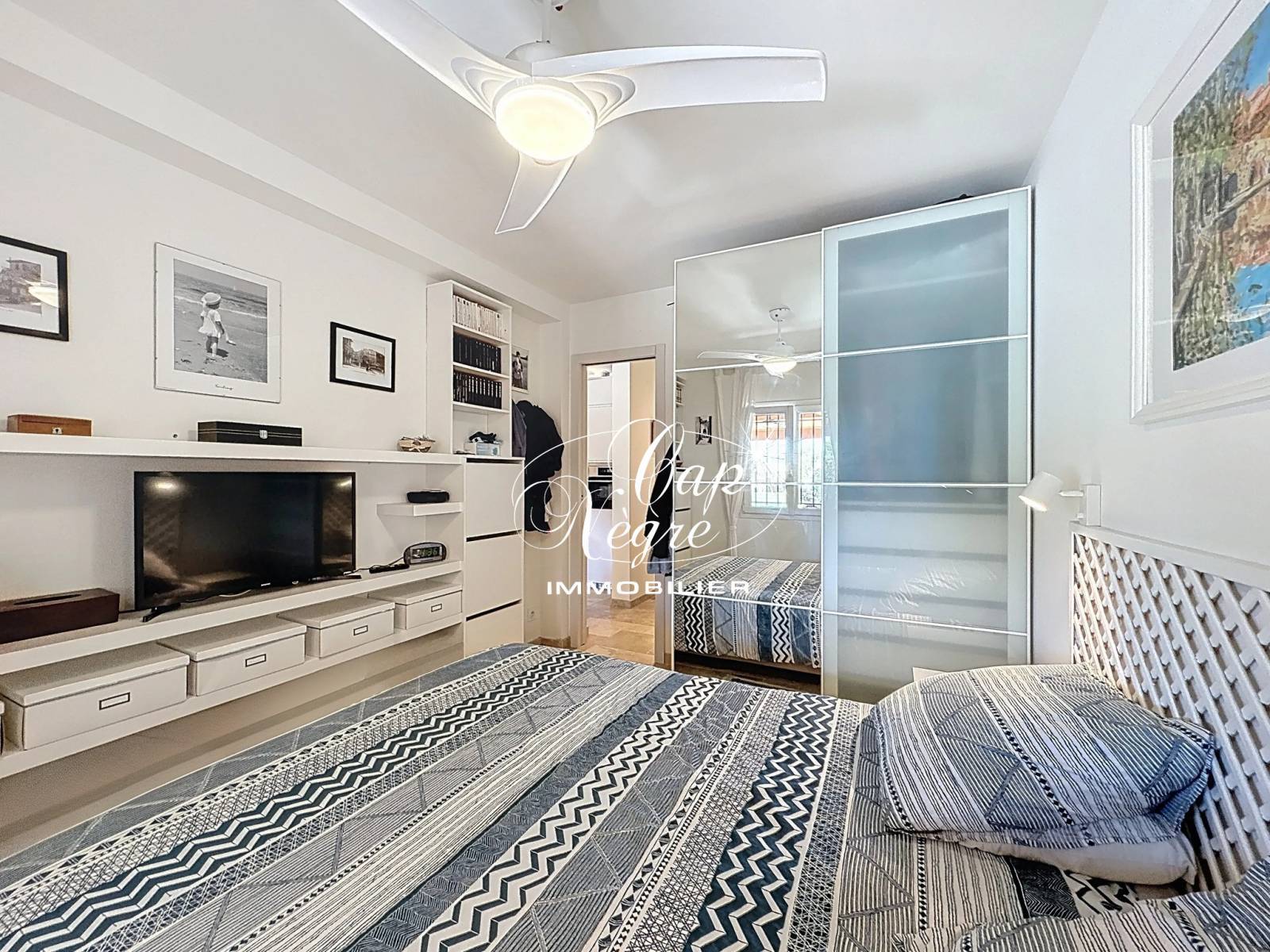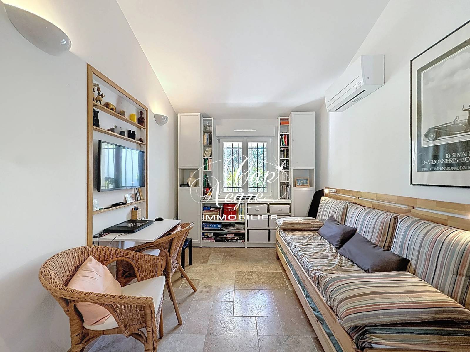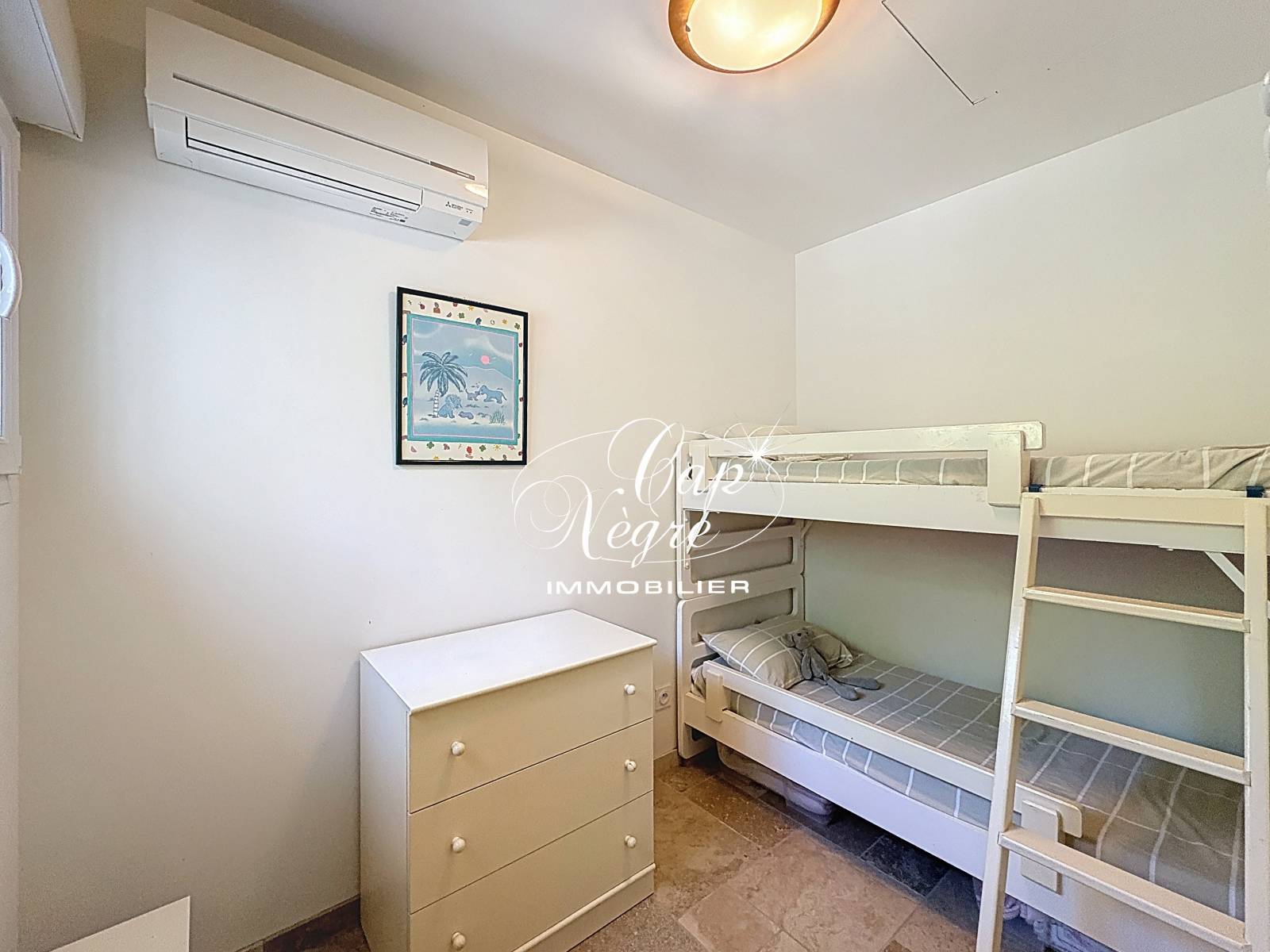 La maison comprend une entrée, un séjour et une cuisine ouverte, deux chambres dont une avec salle d'eau et WC, ainsi qu'une chambre cabine supplémentaire avec fenêtre et climatisation réversible. Une salle d'eau avec WC est également présente.
