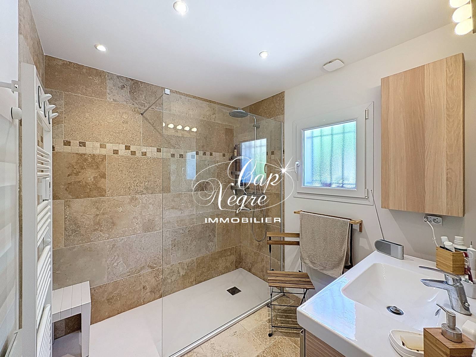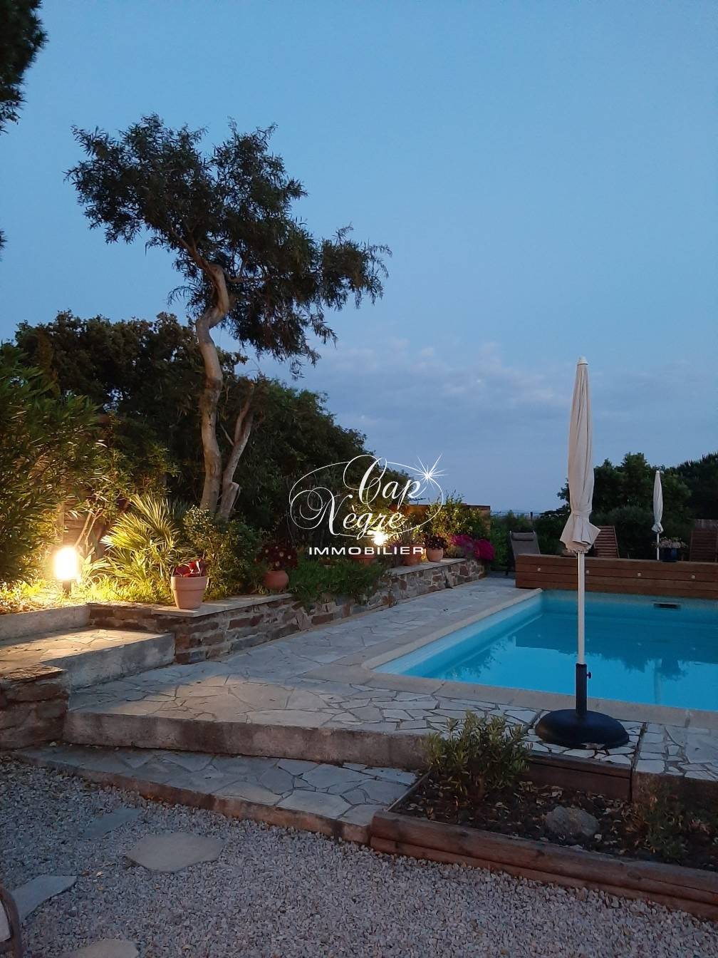 La propriété dispose d'un terrain privatif, d'une terrasse avec avancée en bois et éclairage, ainsi qu'une piscine de 7mx3m offrant une vue mer imprenable.