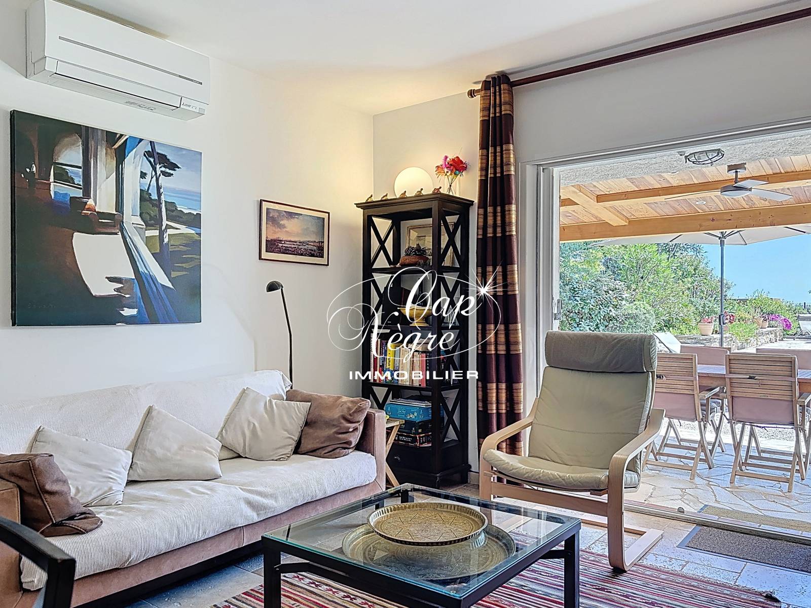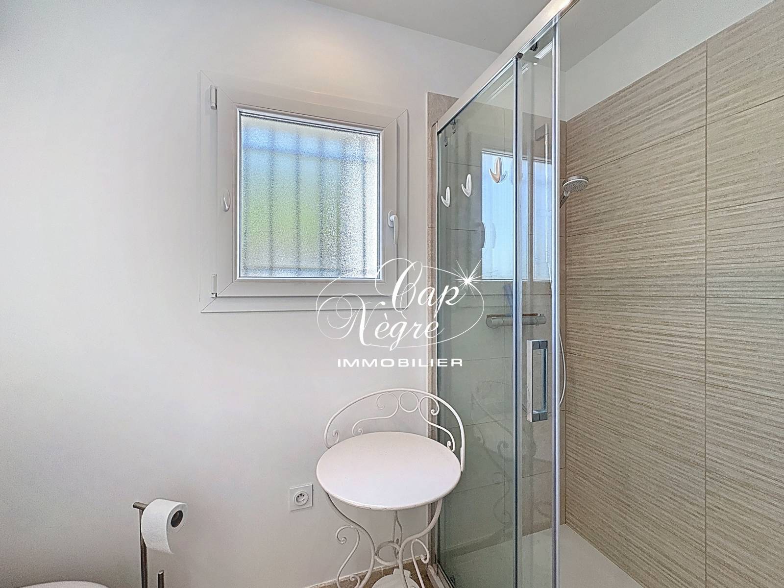Maison mitoyenne de plain-pied située sur les hauteurs du Lavandou, dans un quartier calme et résidentiel. Cette propriété offre un environnement paisible avec une végétation luxuriante.