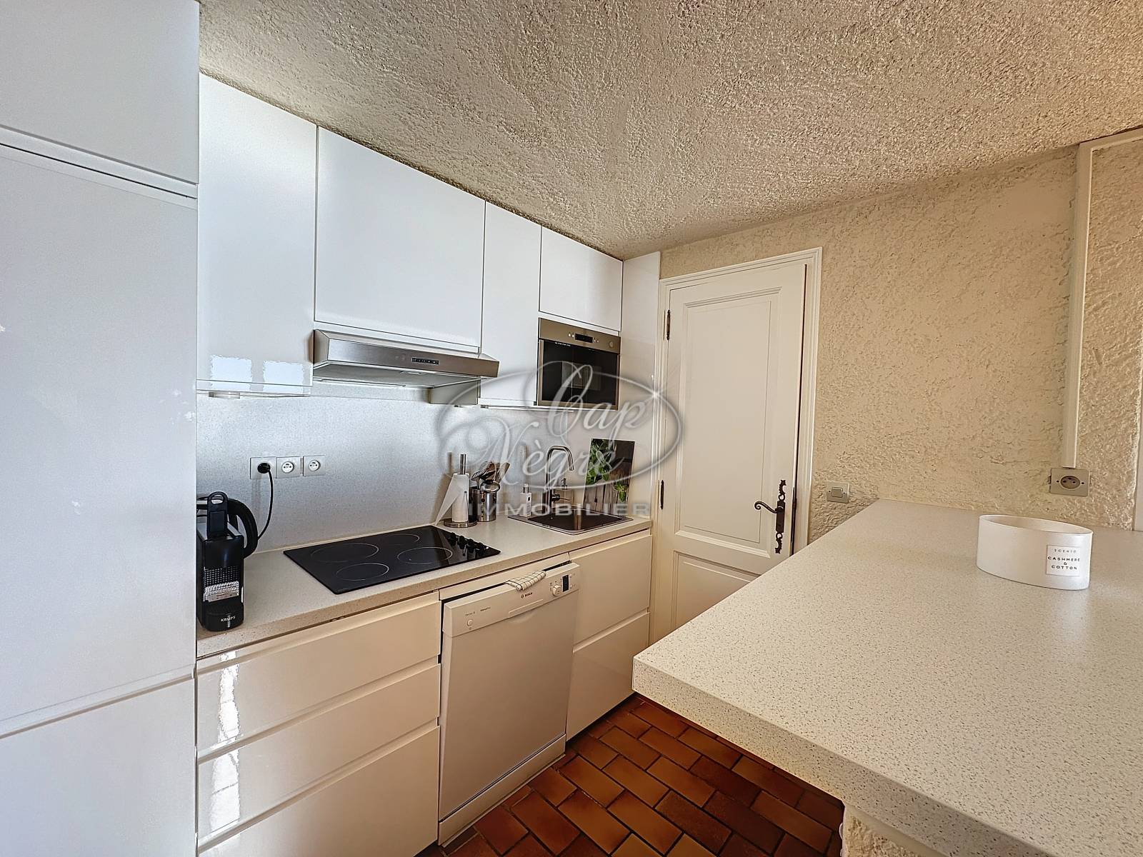 Dès l'entrée, découvrez une pièce à vivre lumineuse avec une cuisine ouverte entièrement équipée avec soin. Le séjour s'ouvre sur une agréable terrasse offrant une vue panoramique sur la mer et les collines environnantes.