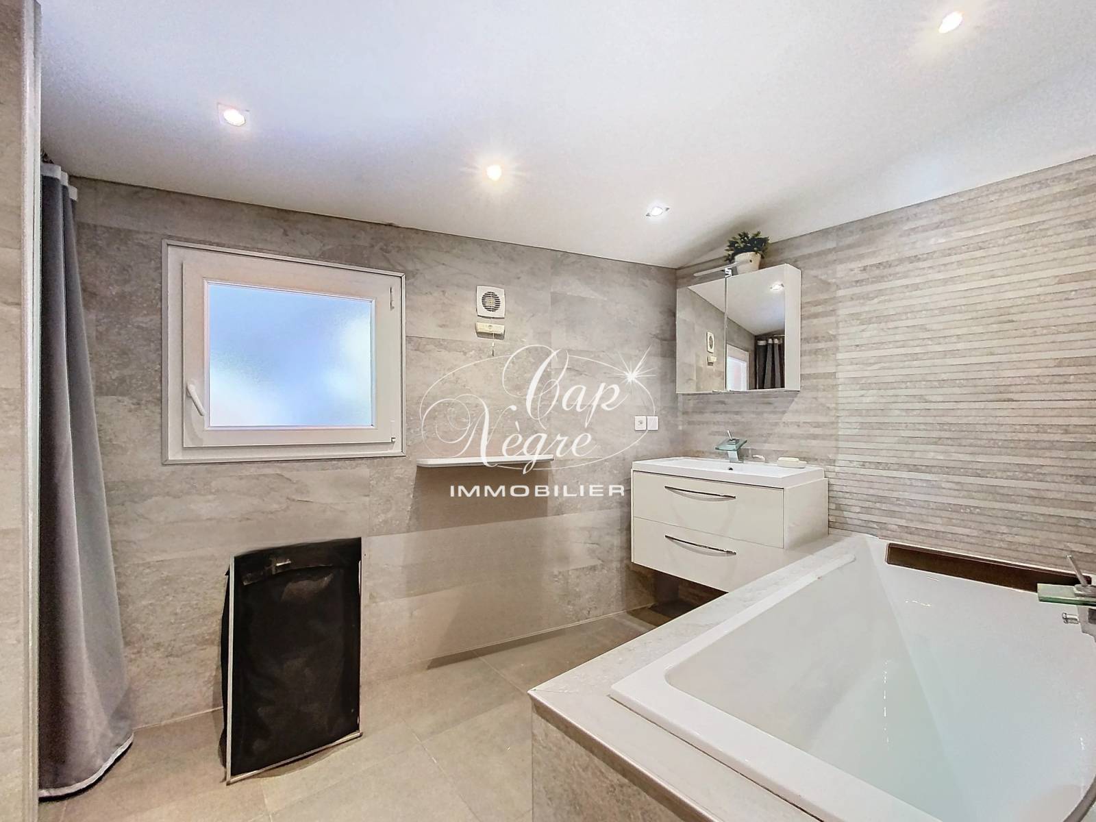 Maison sur 2 niveaux, dans quartier calme et résidentiel. Sur son terrain de 1882m² entièrement clos, aménagé avec des murets en pierre du pays, piscine entourée de verdure, maison parfaitement rénovée avec tout le confort et l'équipement nécessaires. Le bien principal se compose de séjour avec cheminée très lumineux avec baies coulissantes sur les 2 pants est&ouest avec vue dégagée sur la colline, un salon, un couloir aménagé de grands placards/penderies, 2 chambres, salle de bains avec douche&baignoire.