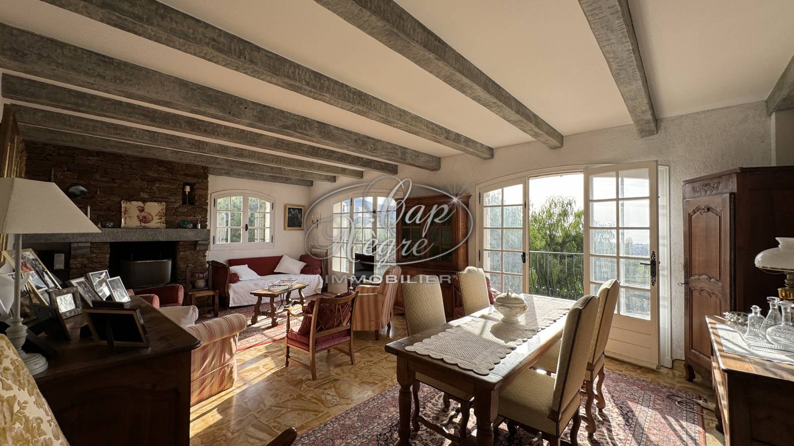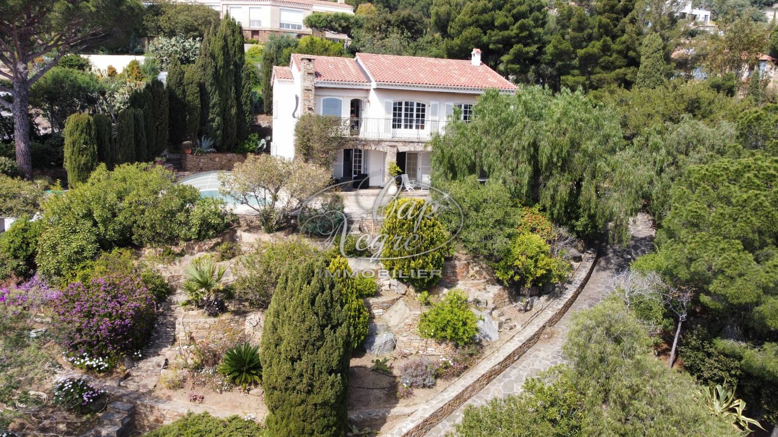 Située au sein d'un Domaine privé, cette maison de charme des années 60 sur deux niveaux comprend un hall d'entrée suivi d'un double séjour avec poutres apparentes et cheminée à foyer ouvert en pierre de Bormes ainsi qu'une cuisine séparée, l'ensemble ouvre sur une terrasse vue mer.