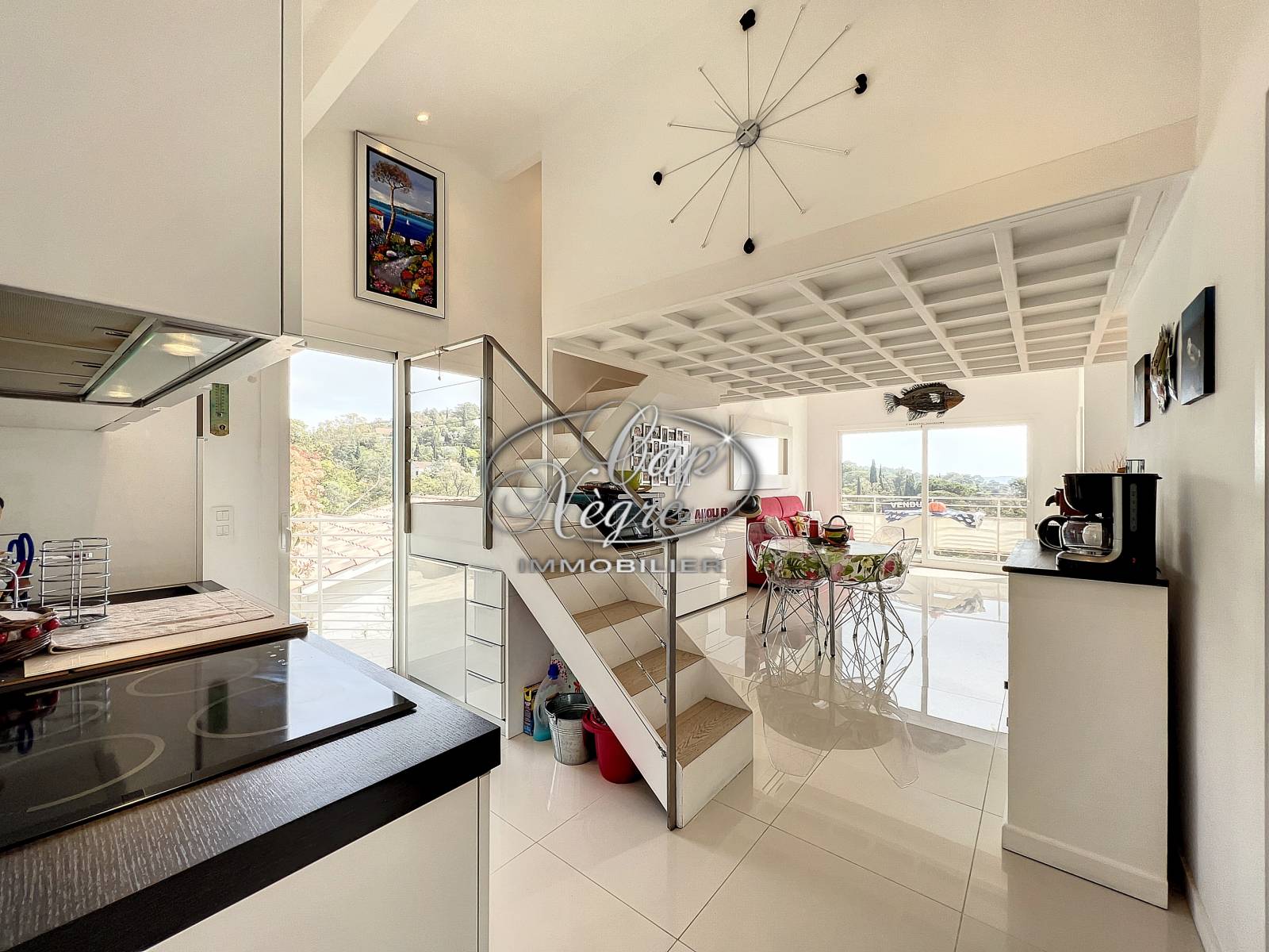 - une entrée, WC séparés avec lave-main, chambre enfants, une salle d'eau, une cuisine équipée ouverte sur bel espace coin repas et salon, lui même ouvrant sur une spacieuse terrasse donnant sur la mer et les îles d'or.
