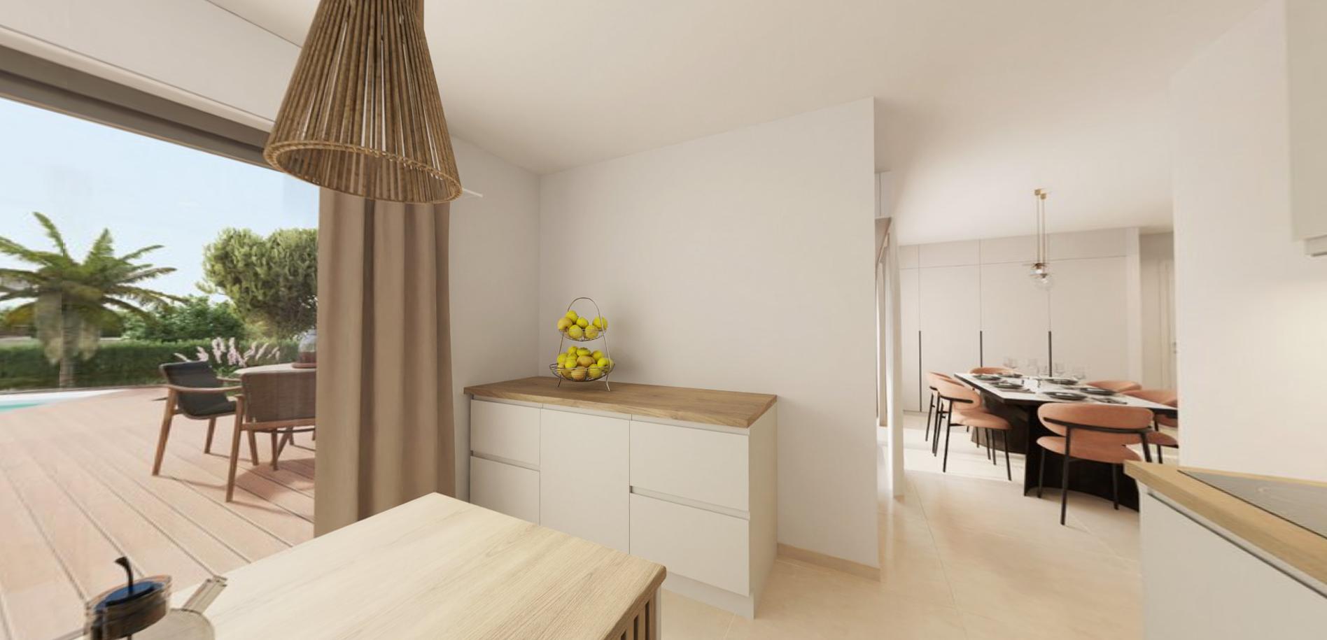 En rez-de-chaussée, son grand espace déjeuner se prolonge d'une vaste cuisine menant au salon et se prolonge par une chambre parentale avec salle d'eau et dressing.