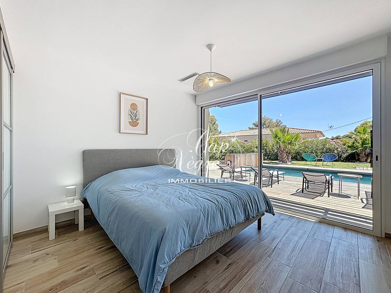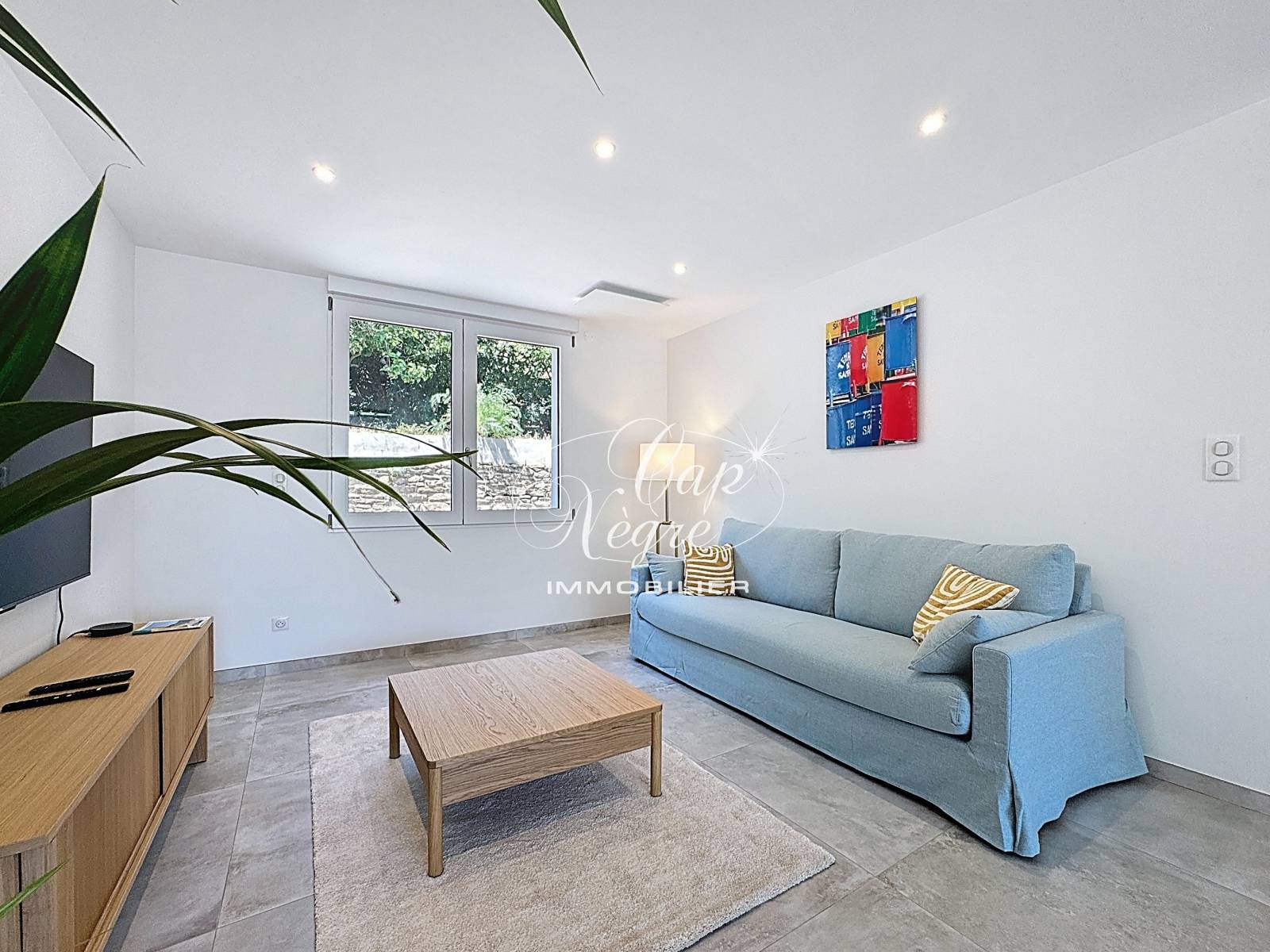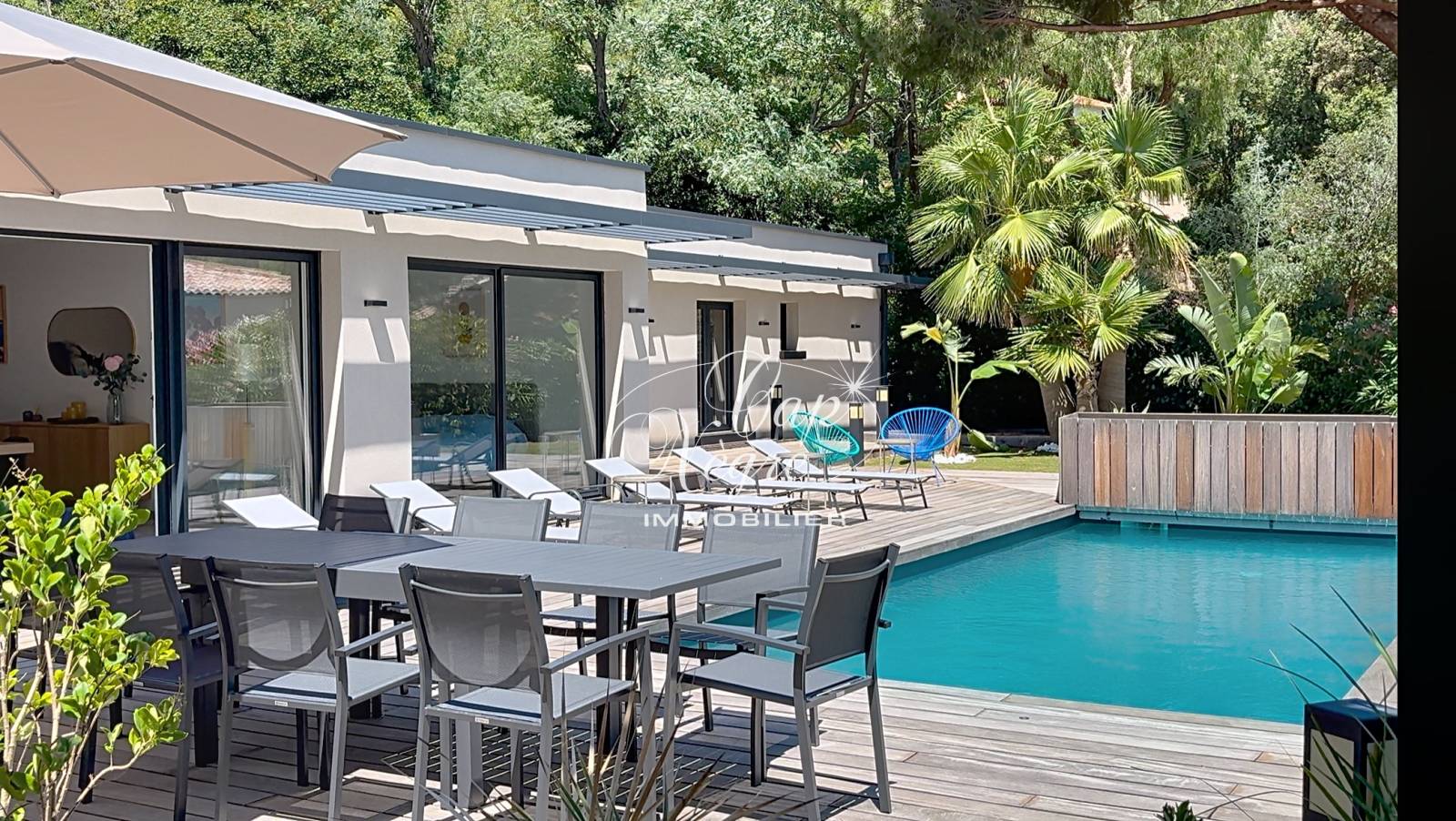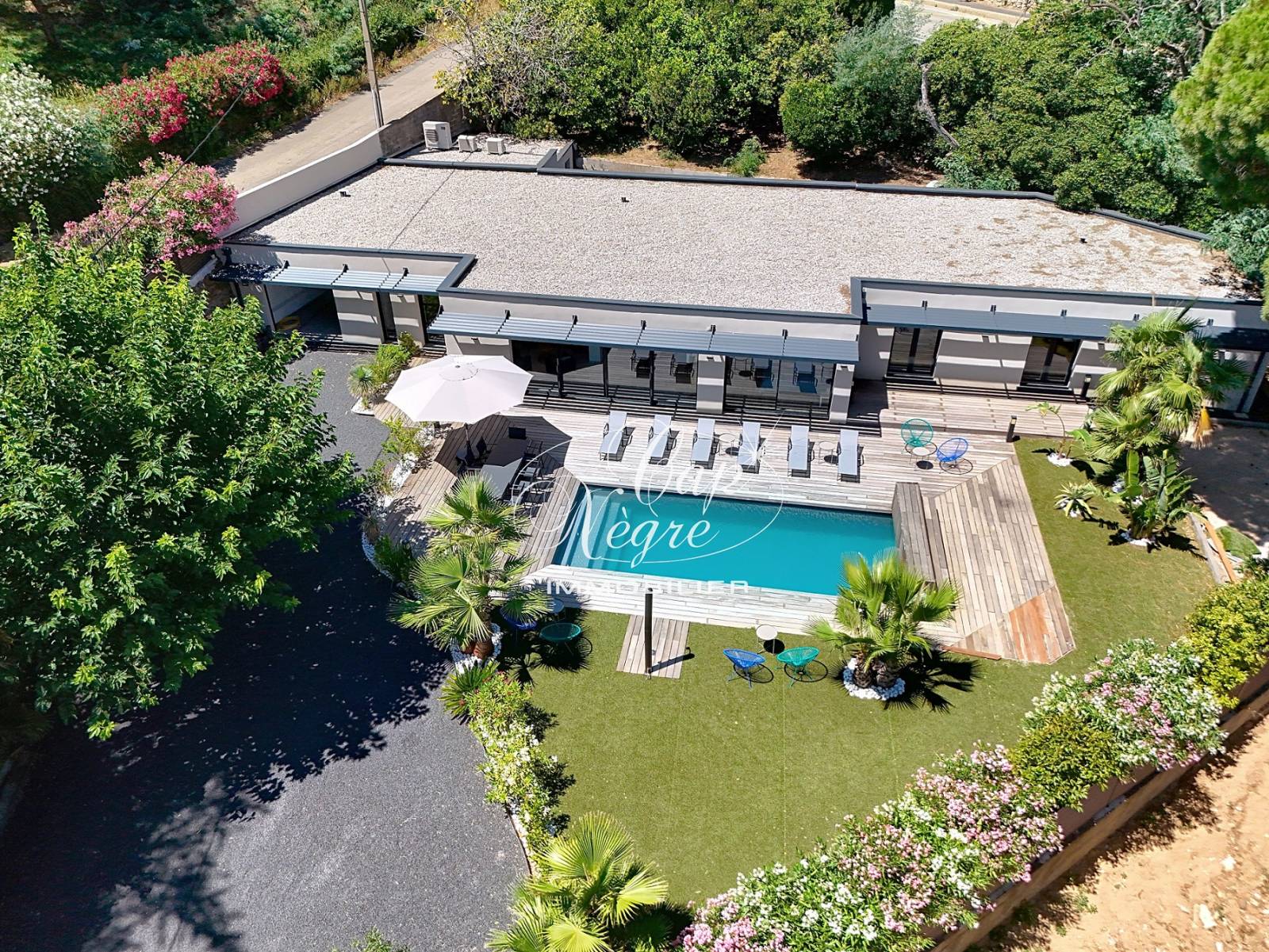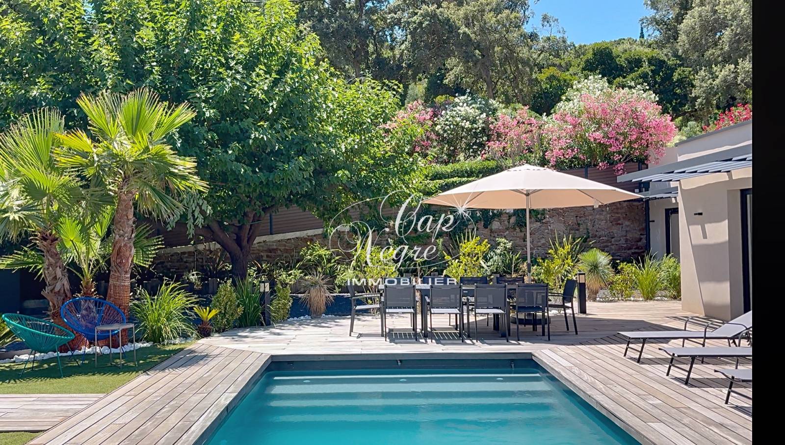 CAP NEGRE IMMOBILIER vous propose à la vente cette villa contemporaine entièrement de plain-pied, située à 300m de la plage, dans un lotissement privé en partie basse de Pramousquier. Implantée sur un terrain de 1300m², elle allie confort, modernité et prestations soignées.